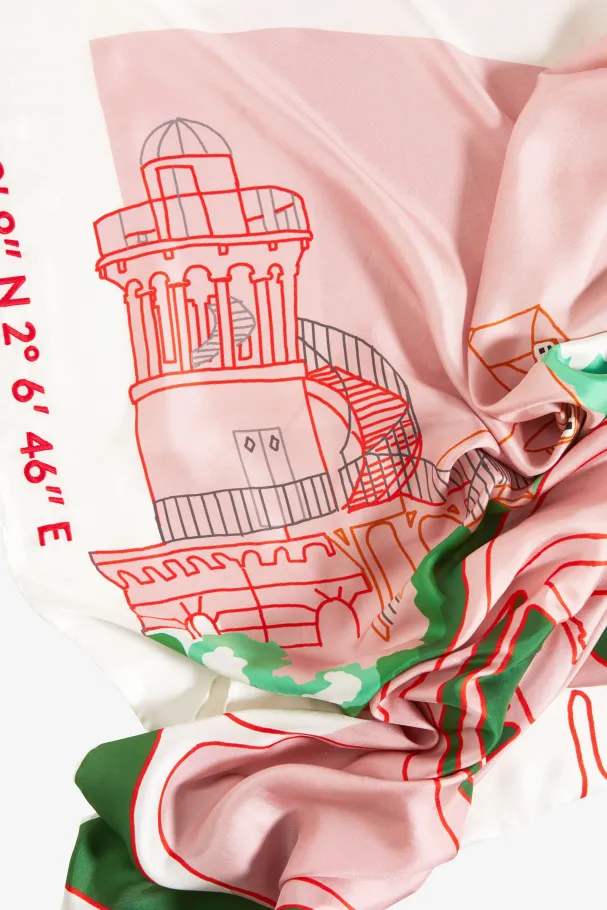 Touchée par l’histoire et le caractère intime de ce lieu, Alexandra Senes, créatrice de la marque Kilometre Paris, a souhaité célébrer l’imaginaire et la fantaisie de la souveraine. Elle a donc créé un immense foulard de soie élégant, singulier, aux motifs inspirés de l’architecture et de la topographie du Hameau. Ce grand carré (130 cm x 130 cm), dessiné à la main et imprimé sur fond rose et vert, évoque la géographie de cette campagne rêvée par Marie-Antoinette.