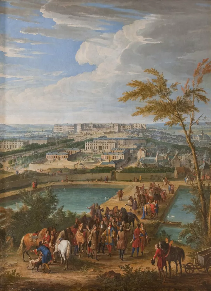 Vue perspective de la ville et du château de Versailles depuis la butte Montbauron ; visite du roi du 14 novembre 1685