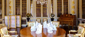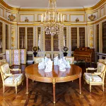 Ultime chef-d’œuvre de l’art royal versaillais exécuté à la veille de la Révolution, le cabinet de Garde-robe est un des rares aménagements d’ampleur entrepris par Louis XVI dans l’appartement privé. La garde-robe de Louis XVI, revêtue de boiseries sculptées et couronnées par une corniche d’architecture, est exceptionnelle par son extrême raffinement. La sculpture de cet ensemble fut confiée aux ciseaux des frères sculpteurs Jean-Siméon et Jean-Hugues Rousseau, qui signèrent lors de leur dernière intervention au Château une de leurs plus brillantes productions. Dans un registre néo-classique, les décors sculptés et dorés déclinent les grands domaines du gouvernement : le commerce, l’agriculture, la marine, la guerre, les sciences et les arts. Rien de futile dans ce programme iconographique, qui évoque plus un cabinet de travail, à l’instar d’un « studiolo » de la Renaissance italienne, qu’une pièce de commodité comme l’indique son appellation de garde-robe. Il s’agit, en effet, d’un lieu consacré au travail, sorte d’arrière-cabinet plus intime que le cabinet d’angle. Le caractère sérieux et appliqué du souverain transparaît ici, loin des thèmes légers voire convenus qui se déployaient dans les décors réalisés pour son prédécesseur. Selon un principe habituel au XVIIIe siècle, cet ensemble est traité en harmonie blanc et or : tous les éléments moulurés et les parties sculptées sont dorés à la détrempe et se détachent sur une peinture à la colle de teinte blanche. Le sol est recouvert d’un parquet à panneaux de type Versailles, axé sur la cheminée.