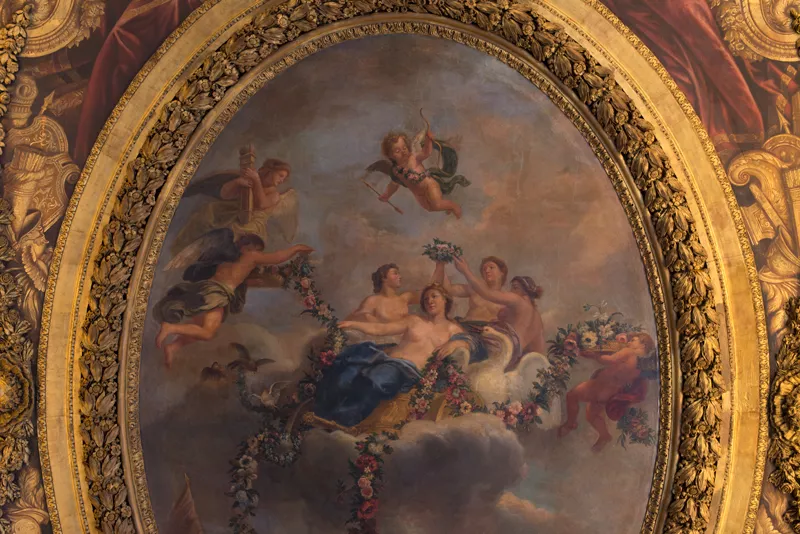 À la suite des deux salons précédents, conçus comme des vestibules, le salon de Mars marquait le début de l’appartement du roi proprement dit par sa fonction de salle des gardes. Sa consécration au dieu de la Guerre est donc tout à fait adéquate. Au centre du plafond, Claude Audran a peint Mars sur un char tiré par des loups. L’œuvre est encadrée par deux compositions ; l’une, à l’est, par Jouvenet : La Victoire soutenue par Hercule suivie de l’Abondance et de la Félicité ; l’autre, à l’ouest, par Houasse : La Terreur, la Fureur et l’Épouvante s’emparant des puissances de la terre. Les voussures, traitées en camaïeu d’or, célèbrent les triomphes guerriers des souverains de l’Antiquité auxquels répondent tout naturellement les hauts faits militaires du roi évoqués par les écoinçons de stuc doré des frères Marsy. Enfin, la corniche accentue la vocation militaire en étant ornée de casques et de coiffures guerrières variées.