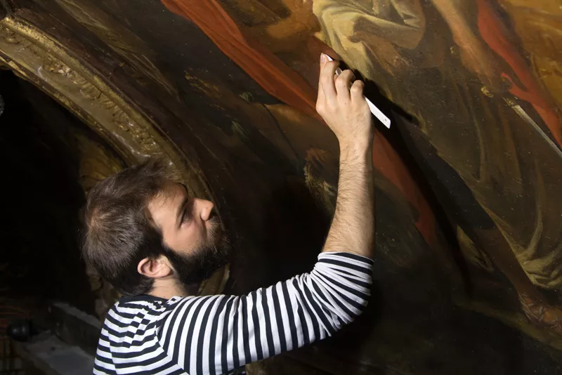 Le plafond peint par Jean-Baptiste de Champaigne représente Mercure sur son char tiré par deux coqs. Le dieu préside aux échanges commerciaux, aux arts et aux sciences, et, comme messager des dieux, aux ambassades, thèmes que l’on retrouve dans les voussures du plafond : Alexandre le Grand faisant porter à Aristote divers animaux étrangers afin qu’il écrive son Histoire naturelle, Auguste recevant une ambassade d’Indiens, Alexandre recevant une ambassade d’Éthiopiens et Ptolémée Philadelphe discutant avec des savants dans la bibliothèque d’Alexandrie. Ces scènes font écho à des événements du règne de Louis XIV comme la réception d’ambassades lointaines, le développement de la bibliothèque royale ou la publication, dans la collection du Cabinet du roi en 1671, de l’Histoire naturelle de Claude Perrault.