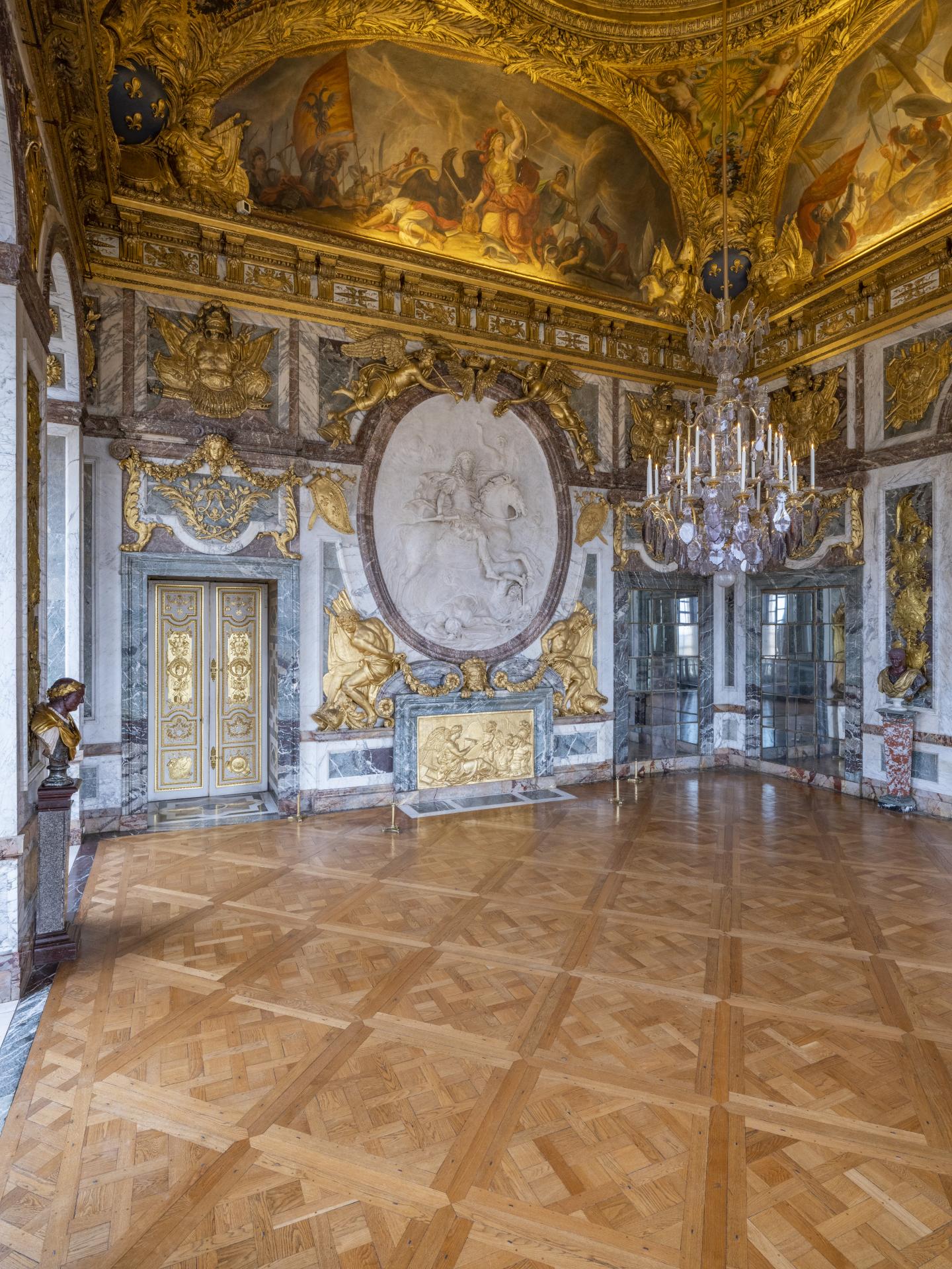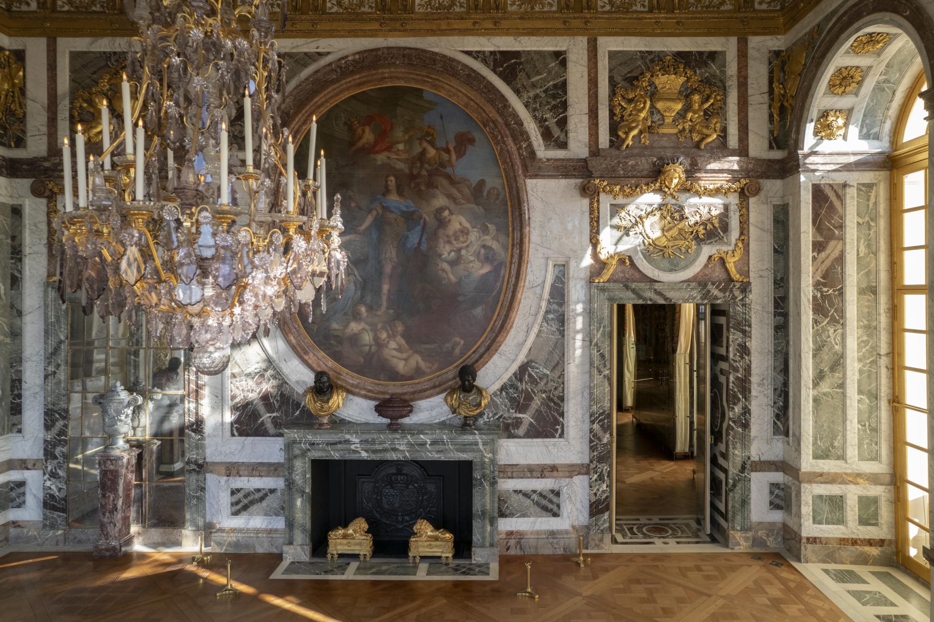 C’est à partir de 1678 qu’Hardouin‑Mansart entreprit la construction du salon de la Guerre. La décoration, achevée par Le Brun en 1686, exalte les victoires militaires qui aboutirent à la paix de Nimègue. Les murs sont revêtus de panneaux de marbre ornés de six trophées et de chutes d’armes en bronze doré. Le mur du côté du salon d’Apollon est occupé par un bas-relief ovale en stuc représentant Louis XIV à cheval foulant aux pieds ses ennemis. Ce chef-d’œuvre de Coysevox est surmonté de deux Renommées dorées et soutenu par deux captifs enchaînés. Au-dessous, dans le bas-relief occultant l’ouverture d’une fausse cheminée, Clio, muse de l’Histoire, consigne pour la postérité les hauts faits du roi. Le plafond en coupole représente au centre La France armée, assise sur un nuage et entourée de Victoires. Un portrait de Louis XIV orne son bouclier. Dans les voussures sont représentés ses trois ennemis vaincus : l’Allemagne à genoux, avec un aigle ; l’Espagne menaçante, avec un lion rugissant et la Hollande renversée sur un autre lion. La quatrième voussure représente Bellone, déesse de la guerre, en fureur entre la Rébellion et la Discorde.