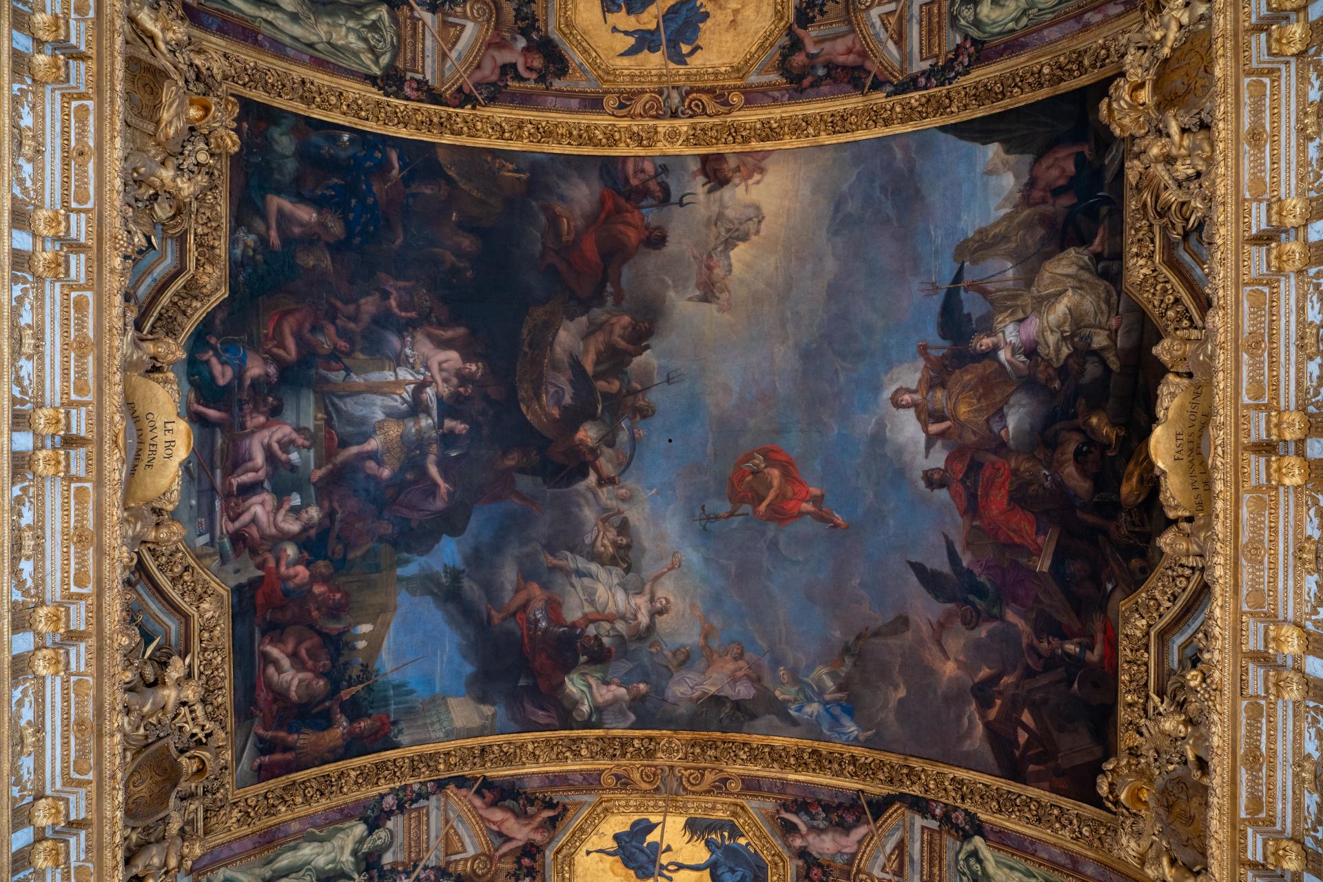 Chef-d’œuvre de la peinture décorative du règne de Louis XIV, le plafond de la Galerie des Glaces, imaginé et réalisé par Charles Le Brun entre 1680 et 1684, délaisse les références mythologiques classiques pour bâtir une iconographie centrée sur le roi. Louis XIV y apparaît comme une figure triomphante, entouré de divinités, de dragons et de personnages allégoriques, illustrant les grandes étapes de son action politique et militaire. À travers ces scènes, le plafond célèbre un roi conquérant et pacificateur, bâtisseur d’un nouvel ordre européen.