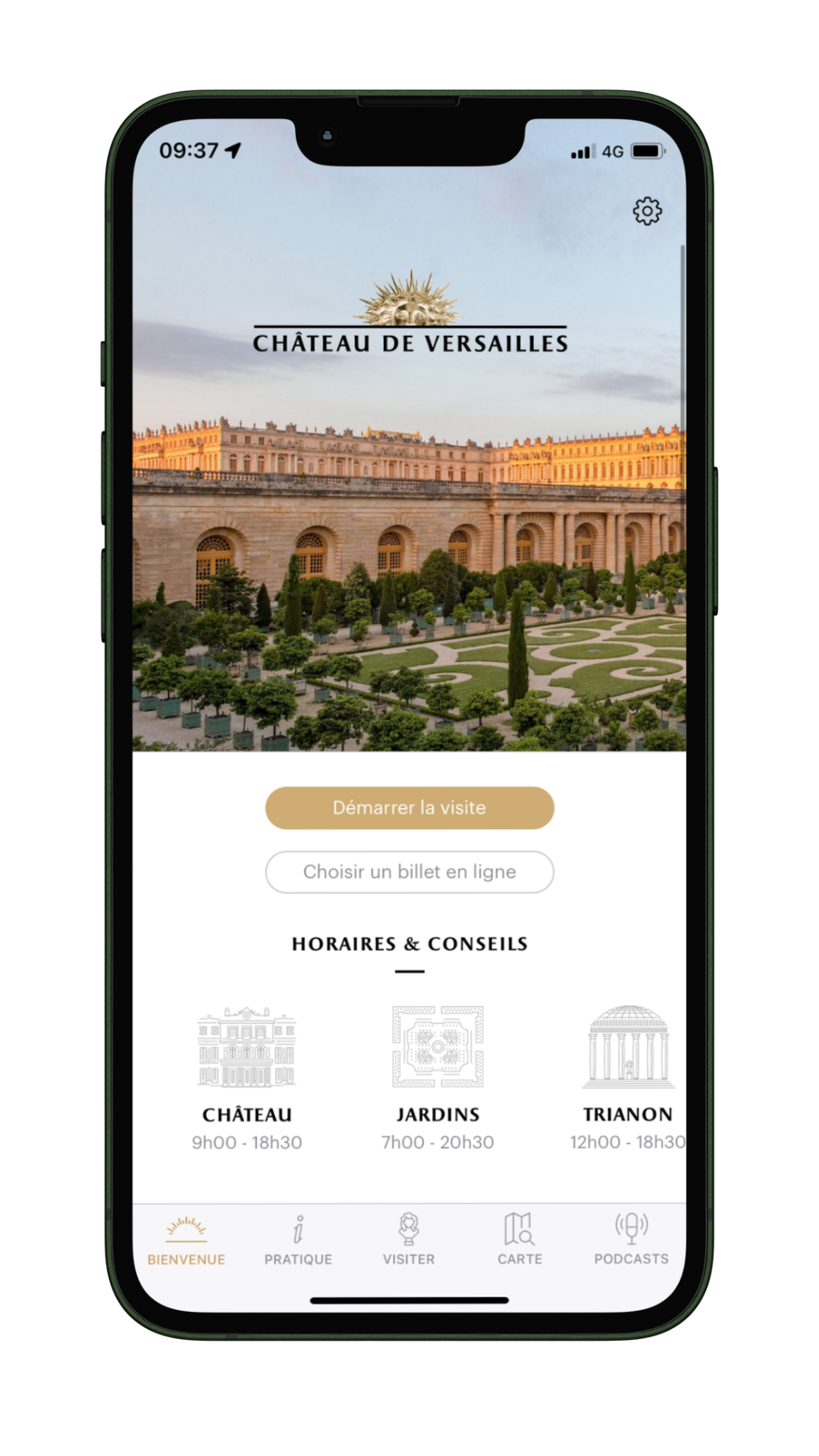 - d'écouter tous les parcours audio (Château, Jardins, domaine de Trianon, galerie des Carrosses),