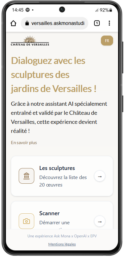 Le château de Versailles propose à ses visiteurs une nouvelle manière de visiter les jardins. En ouvrant l’application mobile du château ou en scannant un QR code placé à proximité d’une œuvre, les visiteurs accèdent à une interface permettant d'engager une conversation orale avec les sculptures. Cet outil de médiation gratuit permet une discussion en temps réel, assistée par une intelligence artificielle, entre une œuvre d’art et son public.