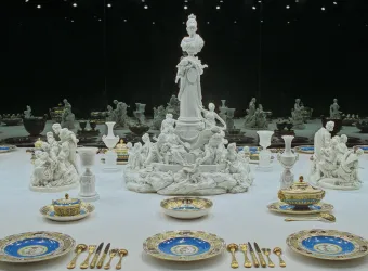 La Cour assiste ensuite au festin organisé à l’endroit du futur bassin de Flore, dans une grande salle octogonale en treillage dont le dôme est ouvert sur le ciel. Au centre d’une table est disposé un grand buffet orné d’une fontaine et d’une vaisselle d’argent. Le festin est suivi d’un bal organisé dans une salle installée au carrefour du futur bassin de Cérès. De forme octogonale également, la salle est précédée d’une galerie de verdure fermée par une grotte de rocailles. Réalisée par Le Vau, elle paraît couverte de marbre et de porphyre.