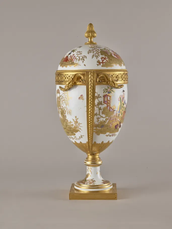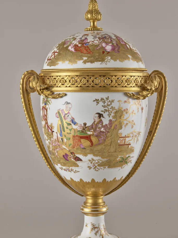 Entre 1775 et 1780, les ornements chinois prennent une place importante dans la nouvelle production de pâte dure mise en œuvre à la manufacture de porcelaine de Sèvres. L'usage de la pâte dure requiert une technique de décoration spécifique, parfaitement maîtrisée par Louis-François Lécot. L'artiste a déployé un usage prodigieux de la dorure appliquée sur de larges zones, se mélant aux coloris apposées au lavis où dominent le bleu, le rose, le vert, le noir. Les personnages chinois et leurs costumes dans des paysages à pagodes, sont soulignés d'un filet d'or ou d'un trait noir à l'imitation des motifs de soieries chinoises. Le travail des montures en bronze doré caractérise quant à lui, parfaitement l'art de Jean-Claude-Thomas Duplessis.