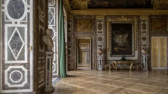 Au premier tiers de la galerie des Glaces, se trouve sur votre gauche une porte miroir donnant sur l’appartement du Roi : le cabinet du Conseil permet de rejoindre la chambre du Roi, précédemment repérée depuis la cour royale ou la cour d’Honneur. À l’extrémité sud de la galerie des Glaces, le salon de la Paix répond symétriquement au salon de la Guerre, également à l’angle du Château, il donne sur le Grand Appartement de la Reine (actuellement fermé pour travaux). Selon les ouvertures de salles, terminez le circuit des Grands Appartements en découvrant soit le Grand Appartement de la Reine, soit l’appartement du Roi.