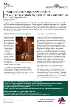 Au cours de ces Rencontres internationales, des conférences se tiendront à l’auditorium du château de Versailles et seront tenues par des historiens, des historiens de l’art et d’autres experts venus d’Autriche, d’Espagne, de France, d’Italie et du Royaume-Uni. Le 25 septembre, elles seront en résonnance avec la grande exposition présentée actuellement au château de Versailles : Cheval en Majesté, au cœur d’une civilisation. Le 26 septembre, les sujets porteront sur