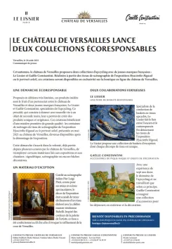Proposés en éditions très limitées, ces produits inédits sont le fruit d’un partenariat entre le château de Versailles et deux jeunes marques françaises, Gaëlle Constantini et Le Lissier, spécialistes de l’upcycling. Ce procédé, qui consiste à donner une nouvelle vie à un objet de seconde main, leur a permis de créér des produits uniques et originaux. Ces créations bénéficient d'une matière première de grande qualité : les centaines de métrages de tissu de scénographie de l'exposition Hyacinthe Rigaud ou le portrait soleil, présentée en mai 2021 au château de Versailles, devenus disponibles après le démontage de l'exposition.