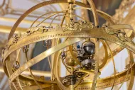 - Le globe de verre, couronnant la pendule, abrite le système planétaire selon Copernic. L’on peut y voir le mouvement des planètes autour du soleil – Mercure, Vénus, Terre, Lune, Mars, Jupiter, Saturne – leurs positions relatives dans le Zodiaque, et la révolution de la Lune autour de la Terre. Elle permet de connaître les deux équinoxes, les deux solstices ainsi que les éclipses solaires et lunaires.