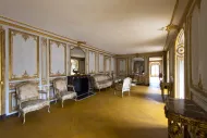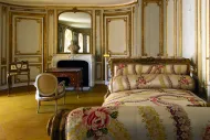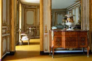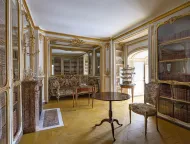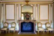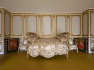L’appartement de madame Du Barry est situé au second étage du château, à proximité immédiate des appartements privés du Roi. Louis XV décide en 1770 de loger sa favorite à cet emplacement prestigieux et convoité, auquel il accède par plusieurs escaliers privés. À la demande de madame Du Barry, les pièces principales sont pourvues d’un décor blanc et or, privilège princier. L’autre moitié de l’appartement présente d’exceptionnels décors polychromes, témoignages rares et précieux du goût du XVIIIe siècle, dont très peu nous sont parvenus jusqu’à aujourd’hui. Loin des espaces de représentation de la Cour, la favorite déploie un très grand raffinement dans ce lieu qu’elle fait agrémenter de mobilier et d’objets d’art à la pointe de la mode.