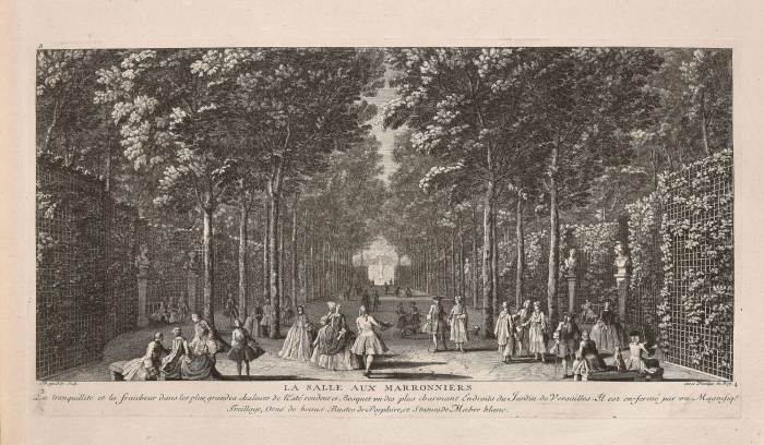Imaginé en 1678 par André Le Nôtre, le bosquet portait alors le nom de Galerie d’Eau, puis de Galerie des Antiques à partir de 1680, en raison de l’ajout de copies d’antiquités romaines. En 1704, l’architecte Jules Hardouin-Mansart repense entièrement le lieu : il y introduit une composition nouvelle, plantée de marronniers au centre, qui lui vaut son nom actuel. L’espace est alors rythmé par des treillages, des niches ornées de statues et deux grands bassins aux extrémités.