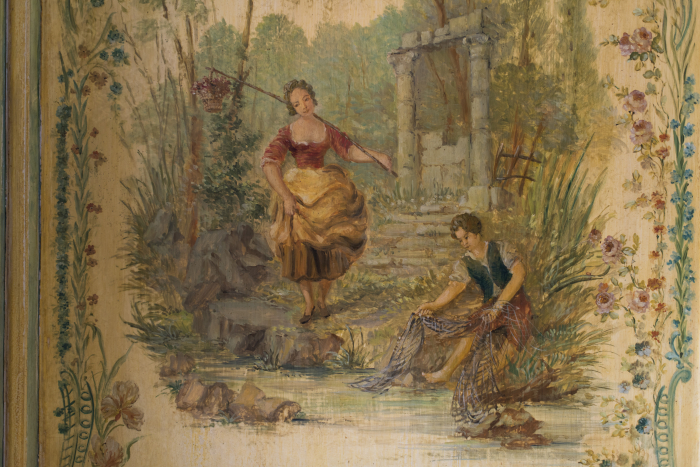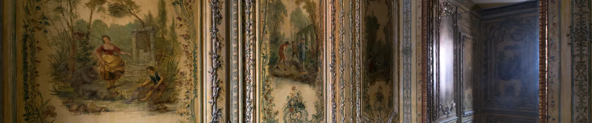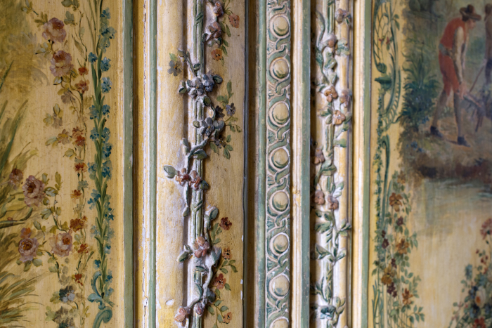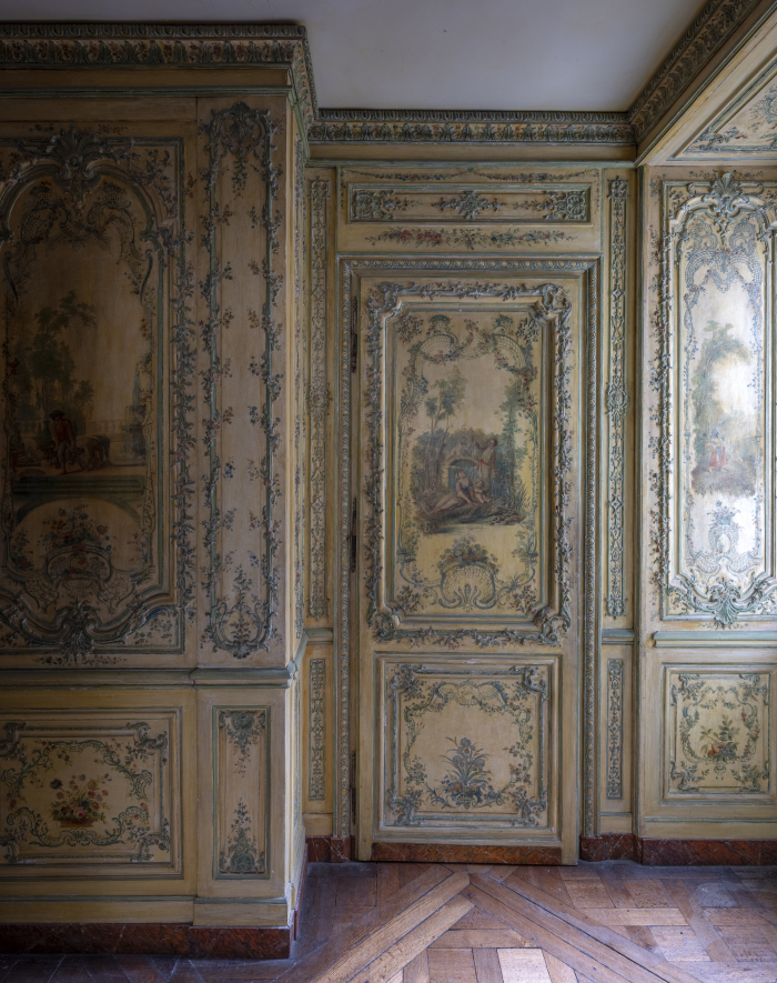 Témoin exceptionnel du goût du XVIIIe siècle, ce cabinet associe avec raffinement lambris sculptés et décors peints « au naturel ». Réalisé dans un style rocaille polychrome, il figure parmi les rares exemples où l’ornementation sculptée dialogue avec des scènes figurées en vernis Martin.