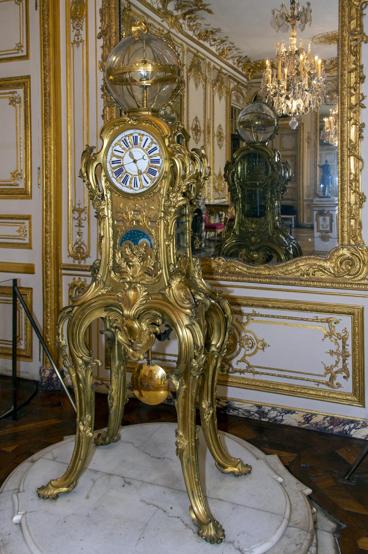 Le 15 janvier 1754, la pendule est installée à Versailles, sur un socle de marbre blanc posé sur le plancher du Grand cabinet du Petit Appartement du roi, jouxtant le cabinet d’angle, qui dès lors prend le nom de cabinet de la Pendule.