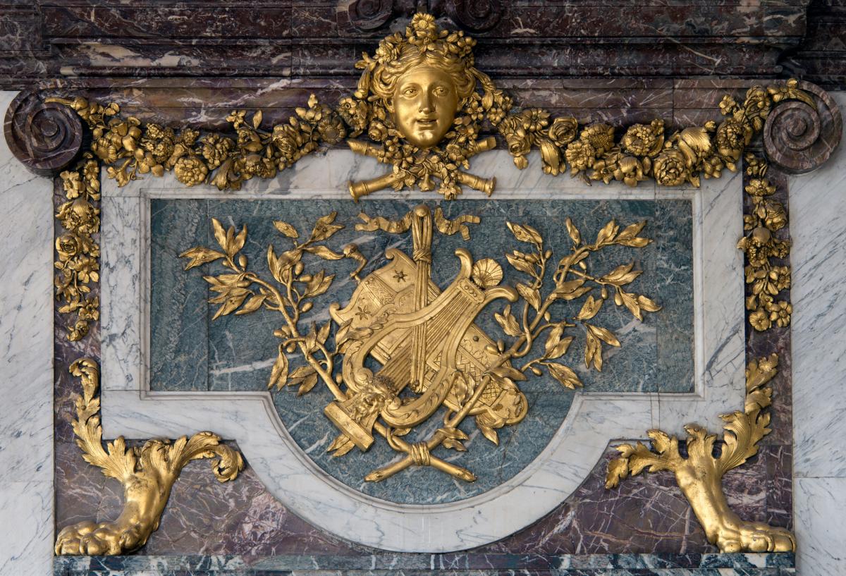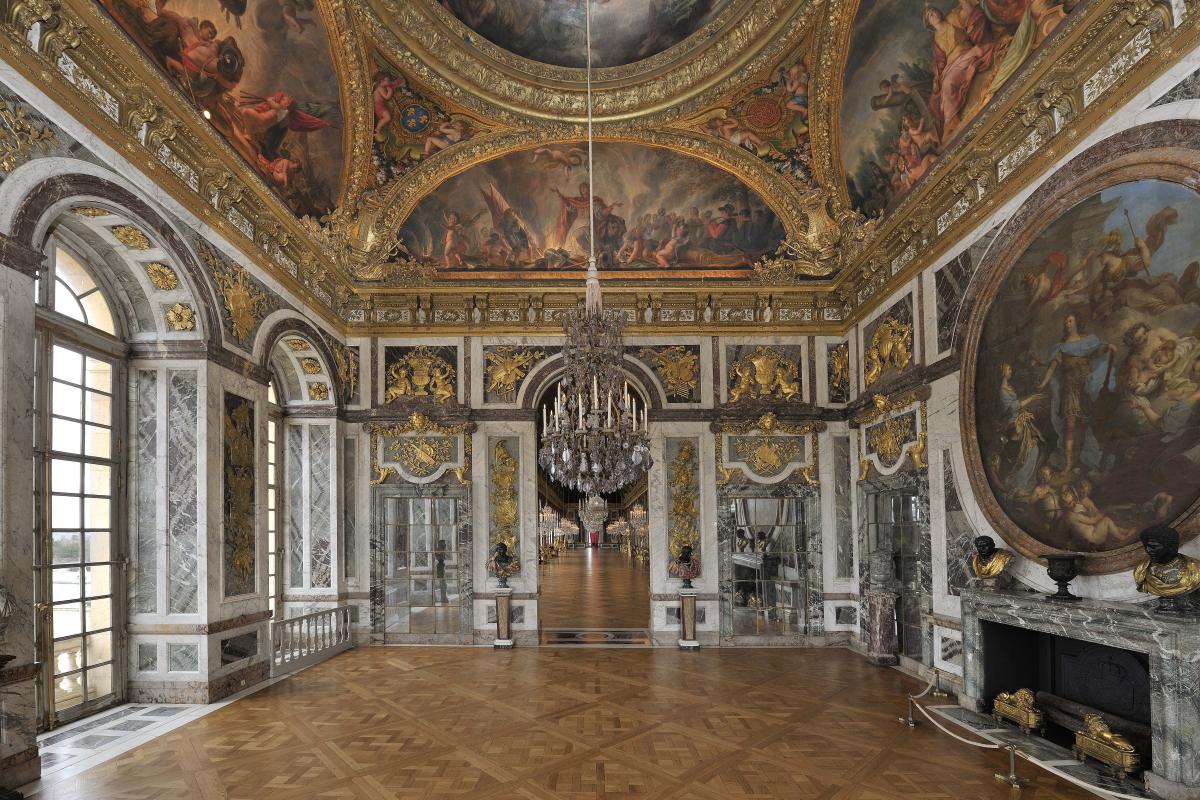 Imaginé pour former un ensemble cohérent avec la galerie des Glaces et le salon de la Guerre (son pendant côté Nord), le salon de la Paix est né de la collaboration entre Jules Hardouin‐Mansart et Charles Le Brun. Aménagé entre 1681 et 1686, il se caractérise par son superbe décor de marbres polychromes agencé en lambris sur toute la hauteur des murs et enrichi de reliefs sculptés en plomb et en bronze dorés, couronné par un plafond peint par Le Brun. Destiné à célébrer la paix, ce décor conclut l’iconographie développée dans la galerie des Glaces, qui célèbre les actions civiles et militaires du Roi Soleil.