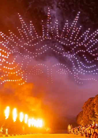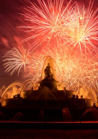 À l’occasion d’une date exceptionnelle, le 14 juillet 2026, les Grandes Eaux Nocturnes célèbrent la Fête Nationale. Un spectacle époustouflant de drones sera proposé lors du feu d’artifice final d’une durée de 30 minutes; un moment d’exception dont les 5 dernières minutes seront accompagnées par l’hymne national, La Marseillaise.