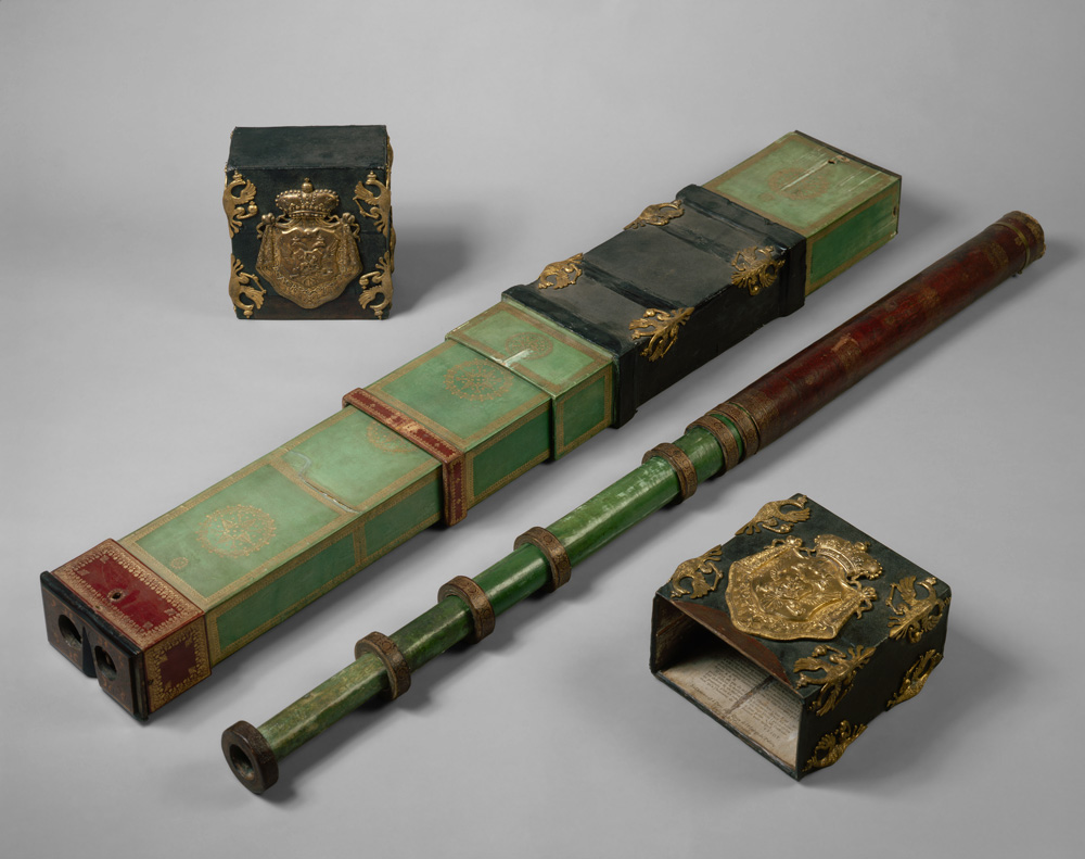 Télescope binoculaire doté de deux couvercles, Fabricant Vesdy, 1680 - 1690, Carton, bois, parchemin, cuivre, bronze doré, verre, estampage.