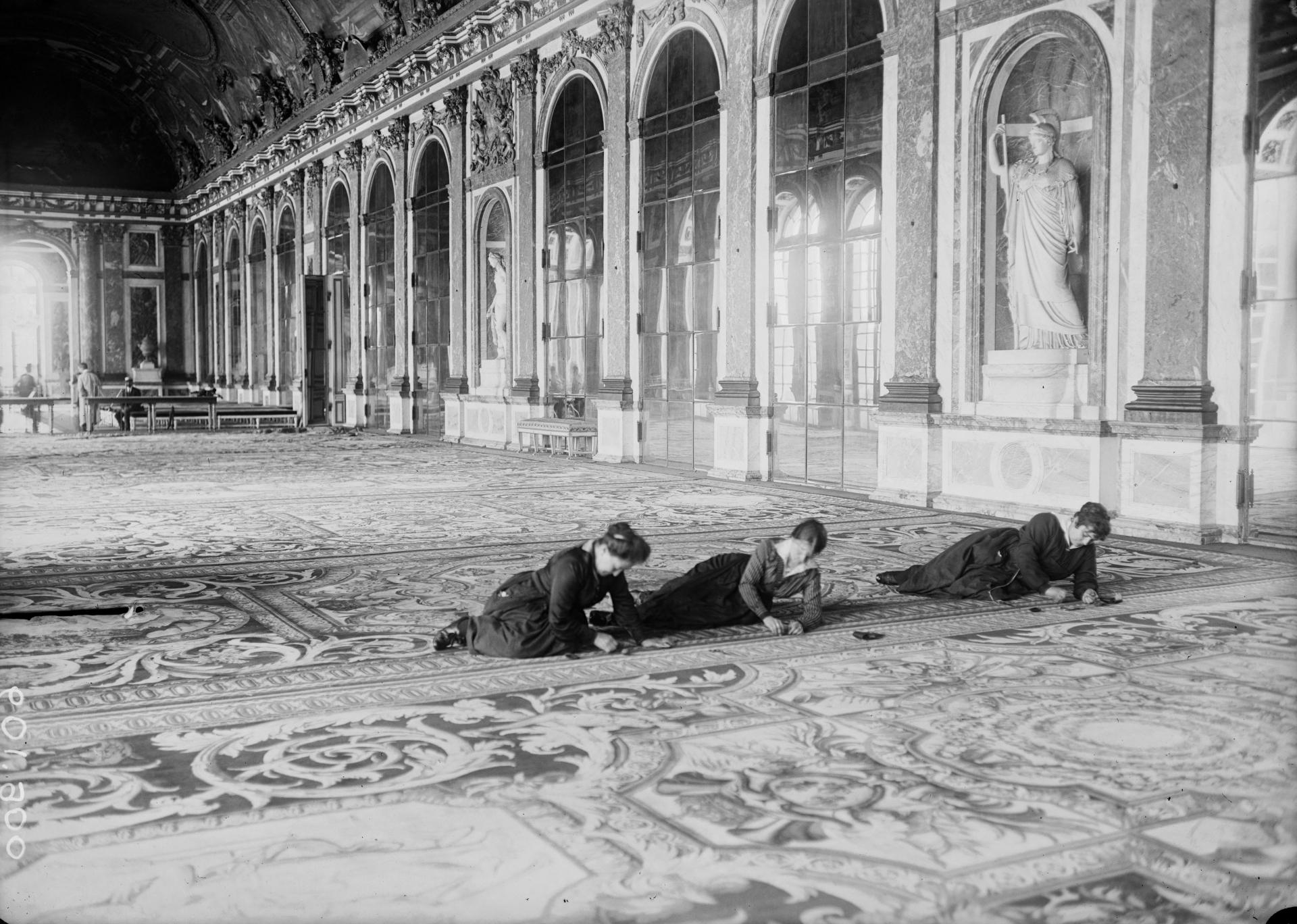Aménagement de la Galerie des Glaces, où sera signé le traité. Versailles, 1919