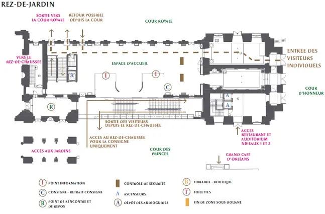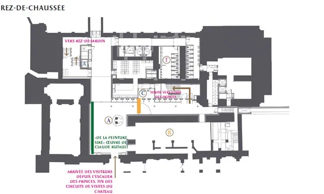 - Un rez-de-chaussée décloisonné regroupe les fonctions de contrôle d’accès, d’information et d’orientation des visiteurs. Point de départ des différents circuits de visite du Château, il débouche directement sur la cour royale.