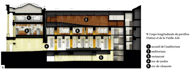 Dominique Perrault a en effet logé un grand escalier enterré le long de la Vieille Aile. Il a préféré cette option à celle de doubler la façade de la Vieille Aile sur la cour des Princes, par une nouvelle façade. Le Pavillon Dufour, très remanié aux XIXe et XXe siècles, notamment pour abriter une partie des bureaux du personnel, comporte très peu d’éléments historiques, qui seront néanmoins conservés. De même, les fenêtres, les portes et les toitures seront restaurés.