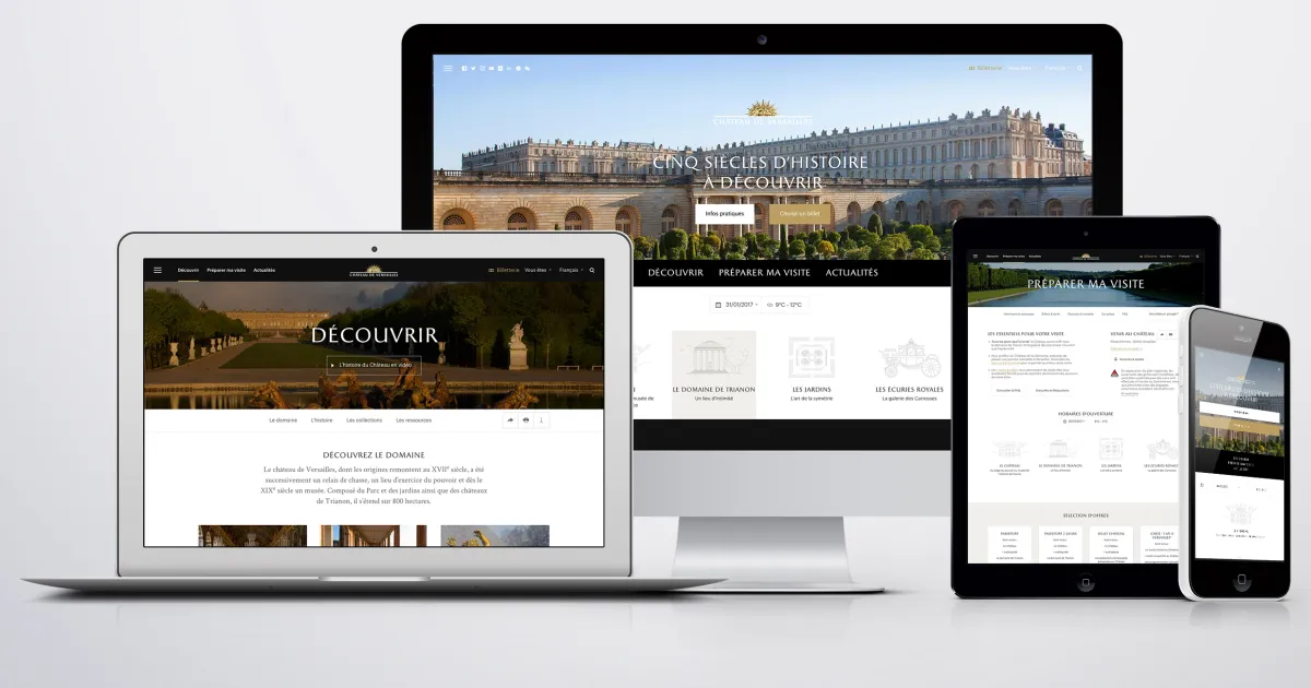 Le château de Versailles vous propose une nouvelle version de son site internet, entièrement repensé pour améliorer votre expérience de visite et s'adapter à vos usages. Premier contact avec le Domaine, il a pour objectif de mieux vous aider à préparer votre venue tout en vous permettant de partir à la découverte des collections ou des actualités du Château. Grâce à son design responsive, il est consultable aisément sur mobile, tablette ou ordinateur.