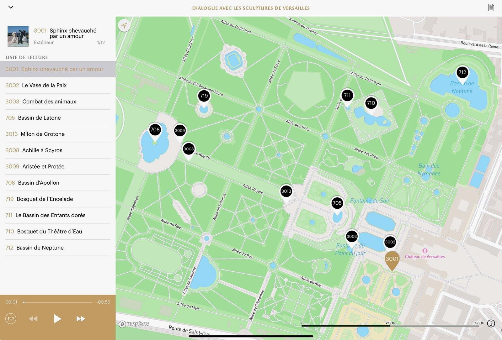 Que vous soyez sur place ou ailleurs, retrouvez toutes les sculptures dans l'application en vous rendant dans le parcours « Dialogue avec les sculptures de Versailles ». Une carte géolocalisée vous permet de localiser précisément chaque œuvre dans les jardins.
