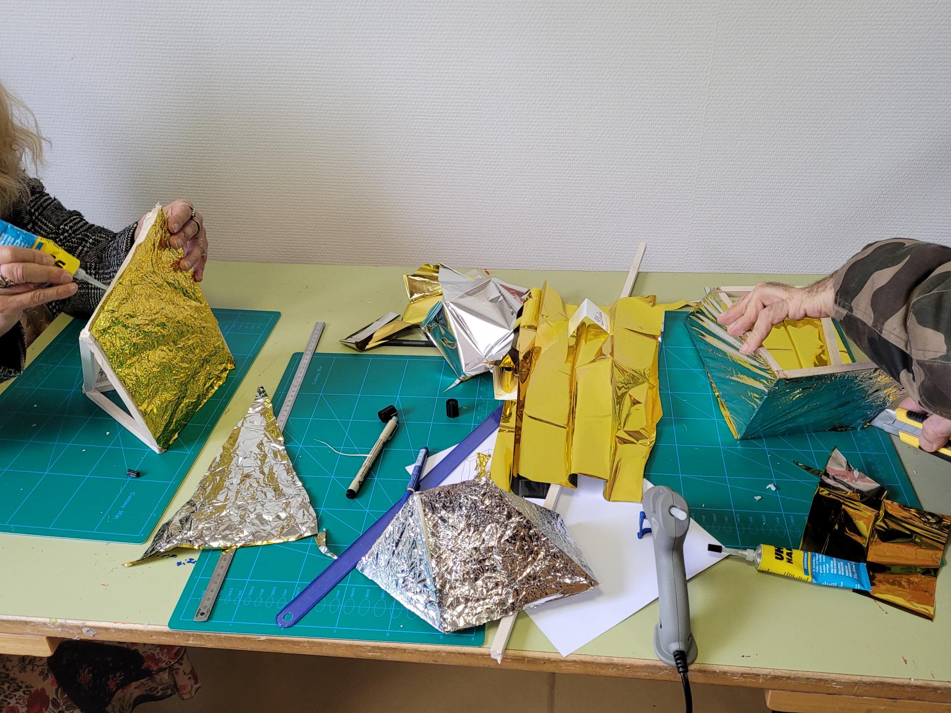 Ce projet d'ateliers plastiques et sonores propose de libérer le potentiel artistique de chacun des participants. Un atelier plastique encadré par l’artiste Virginie Yassef, invite les participants à créer des formes géométriques et de les recouvrir de papiers argentés ou dorés. Certaines de ces figures seront reproduites à grande échelle et dotées d’un dispositif sonore créé lors de l’atelier mené par Charles-Edouard de Surville, artiste spécialisé dans le design sonore.