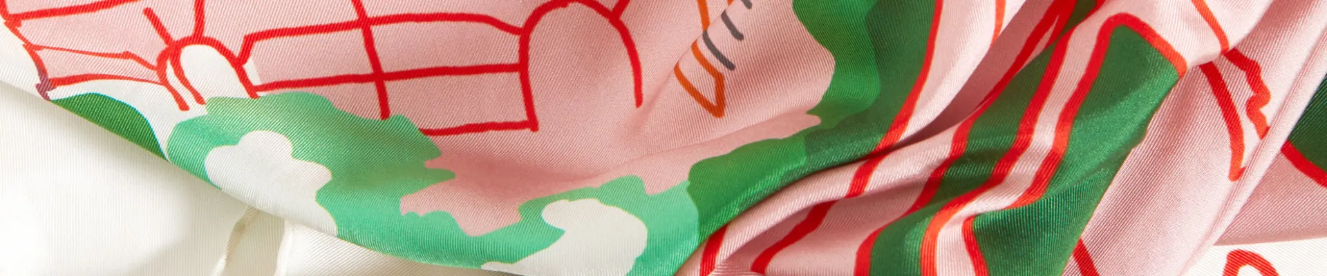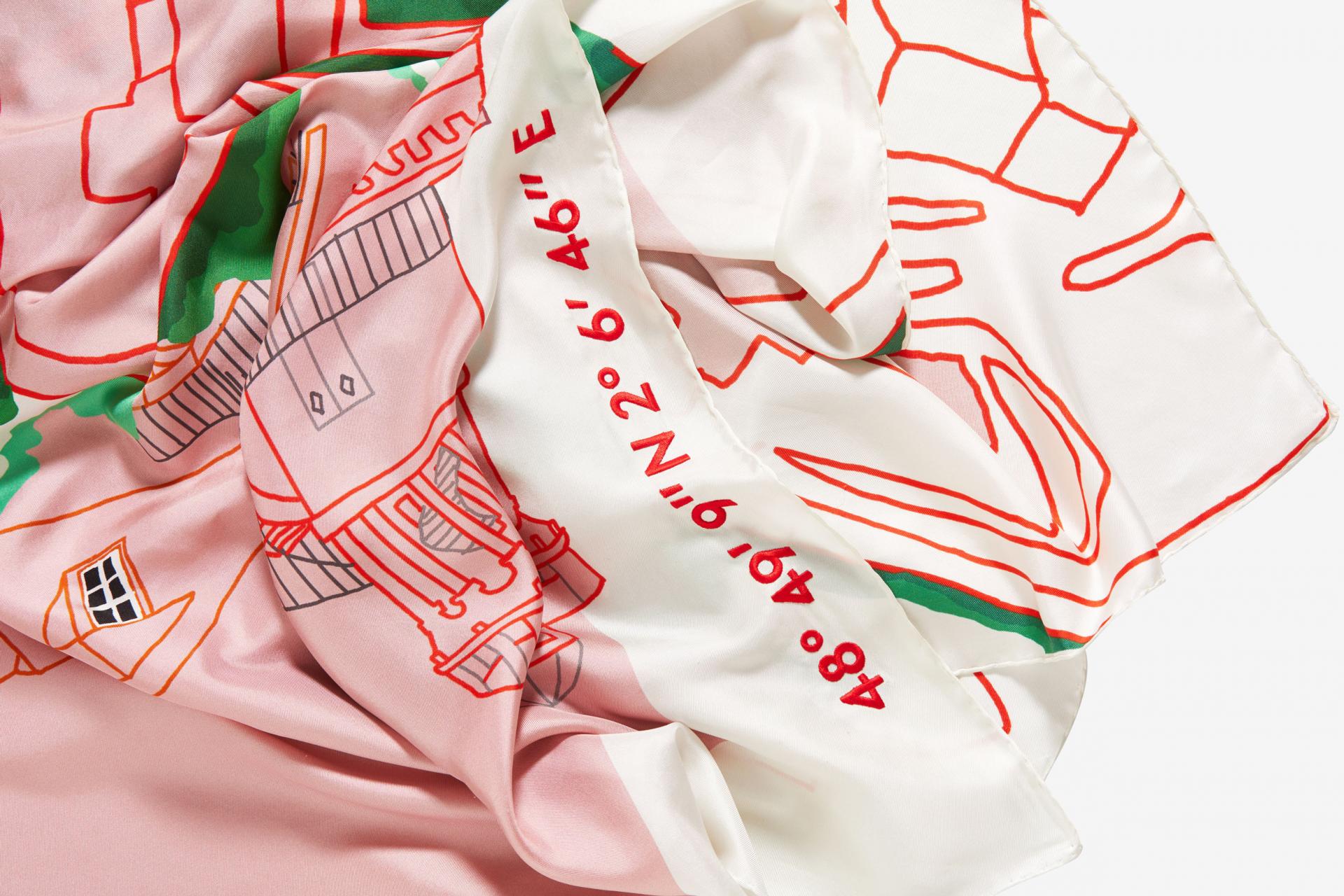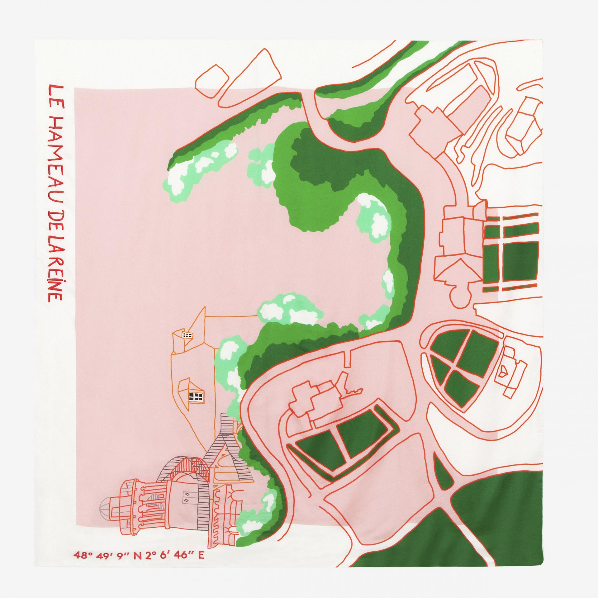 Touchée par l’histoire et le caractère intime de ce lieu, Alexandra Senes, créatrice de la marque Kilometre Paris, a souhaité célébrer l’imaginaire et la fantaisie de la souveraine. Elle a donc créé un immense foulard de soie élégant, singulier, aux motifs inspirés de l’architecture et de la topographie du Hameau. Ce grand carré (130 cm x 130 cm), dessiné à la main et imprimé sur fond rose et vert, évoque la géographie de cette campagne rêvée par Marie-Antoinette.