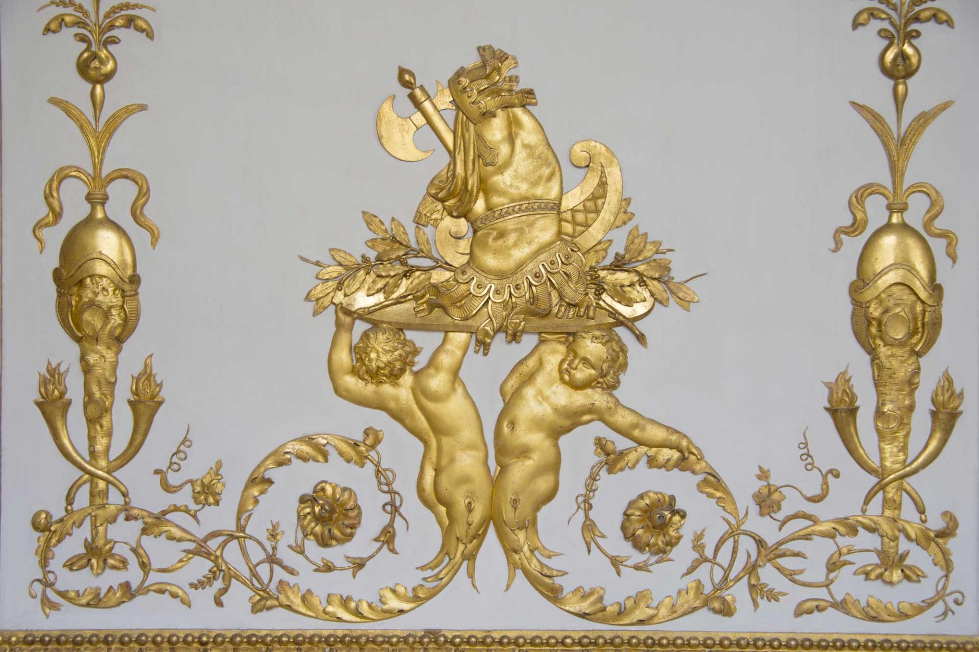 Détail du cabinet de garde-robe de Louis XVI : motif avec cuirasse anatomique, hache et pelta.