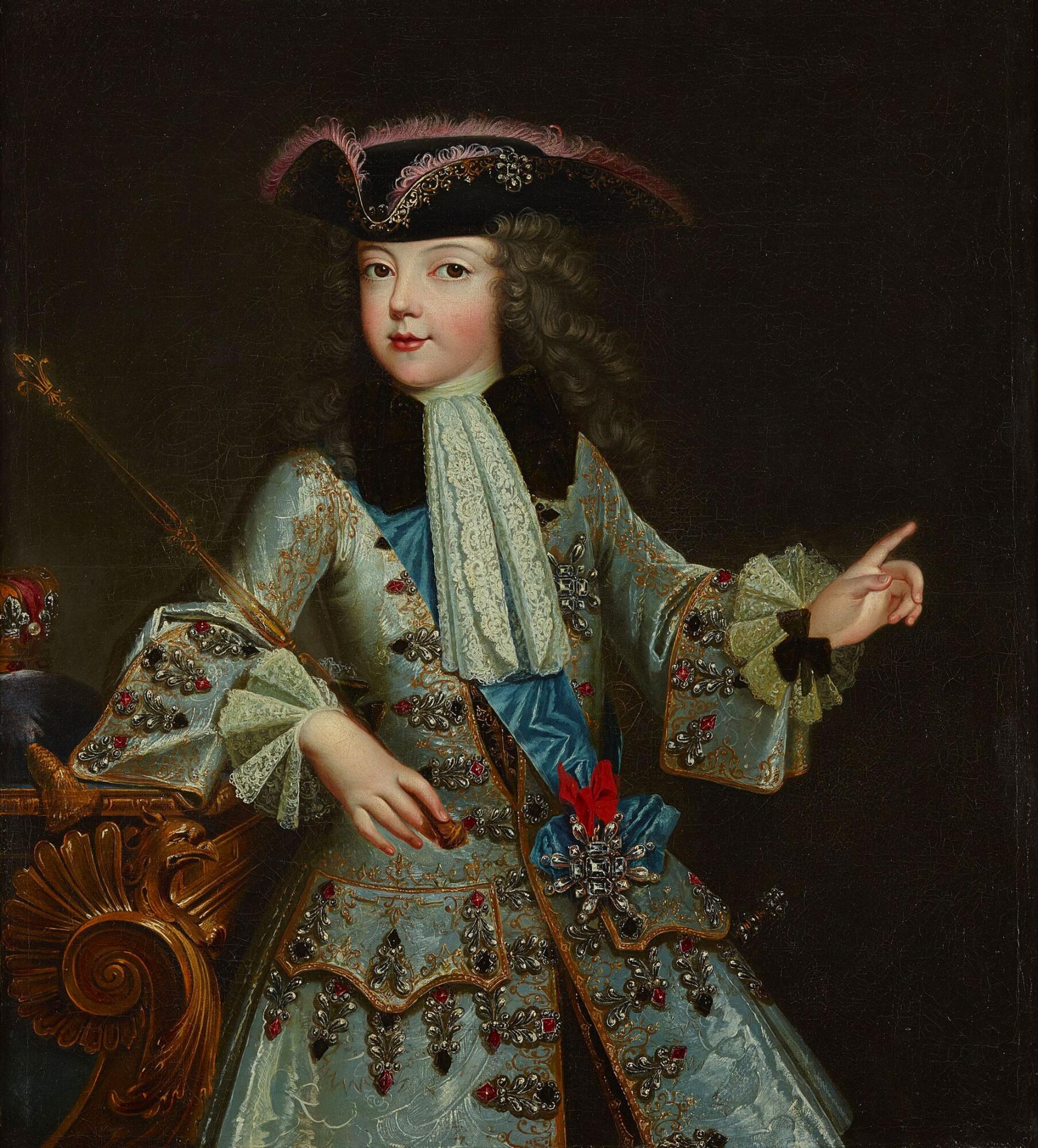 L’élégance du jeune Louis XV dans une peinture peu connue de Justinat. L’enfant revint à Versailles après ses années parisiennes en juin 1722. Il a douze ans, plus tout à fait un enfant, presque un roi. Dans une position d’une élégance inouïe, il tient le monde entre ses deux index, un index d’une main encore enfantine immobilise un mince sceptre, l’autre index se tend vers l’avenir. La pointe d’un élégant tricorne façonne sa détermination. Son corps dans un habit argenté est empreint de danse baroque. Le noir de sa cravate et du nœud au poignet souligne la blancheur de la peau et la finesse du sourire. Il plonge ses yeux dans notre regard, prêt à secouer sa perruque bouclée et à faire scintiller son habit couvert de diamants d’un geste rapide de l’enfance partant d’un grand éclat de rire. Tout dans cette image, l’oppose au directif et magnifique Louis XIV. Tout respire un siècle nouveau.