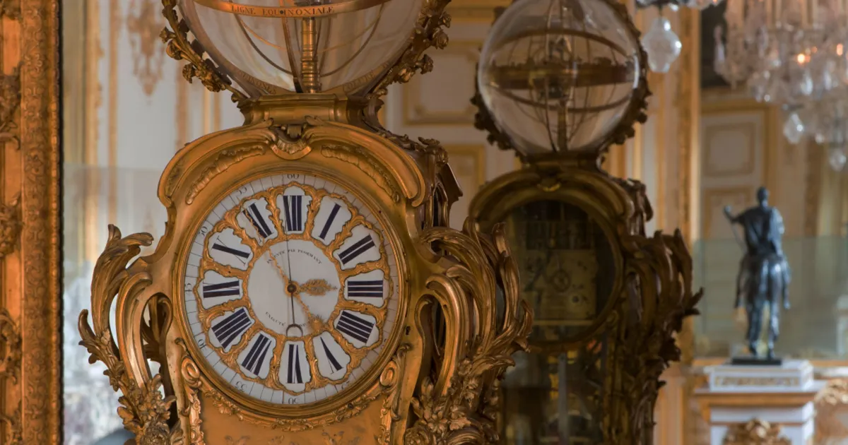 J’apprécie de m’attarder à un angle de l’appartement intérieur du roi où je jette un regard vers la droite, vers le Méridien de Versailles, matérialisé par une baguette de cuivre qui brille à l’horizontal sur le parquet du cabinet, et de tourner la tête vers la gauche, vers le grand cadran solaire vertical dans la Cour des cerfs. Cet axe qui diagonalise le carré de la cour des Cerfs me fait percevoir la passion intime de Louis XV pour l’astronomie, passion qu’il exerce régulièrement depuis son enfance. Passion pour laquelle il a tenu, au cœur même de la splendeur du style qu’il impose aux meubles, aux horloges dans ses appartements personnels, à matérialiser au sol et au mur les outils de mesure du temps et de l’espace. Et là, retentit le discret parcours du temps des secondes de l’horloge de Passement, interrompu par son tintement régulier des quarts d’heure : la mesure du monde selon Louis XV.