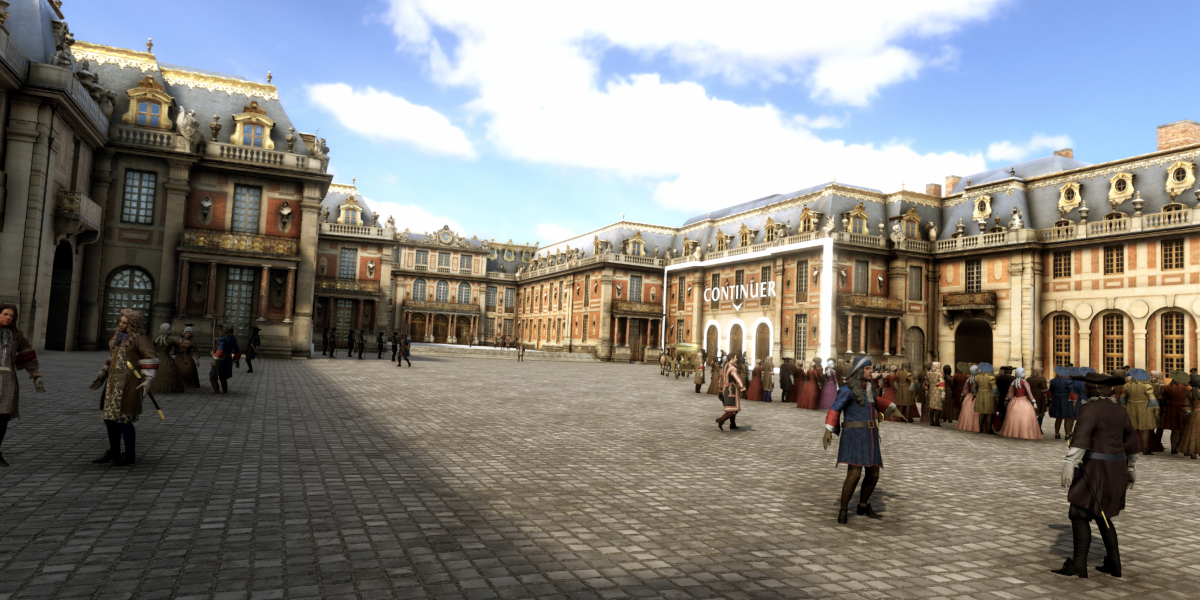 Disposez le casque sur vos yeux, prenez les manettes en main … et profitez d’une immersion totale et inédite dans le Versailles des XVIIe et XVIIIe siècles ! Évoluez dans différents lieux du Château grâce à la liberté offerte par la réalité virtuelle, approchez-vous des membres de la Cour qui vous entourent, et laissez-vous guider par l'Histoire. De la Cour royale à la galerie des Glaces en passant par le Grand Appartement du Roi, les Petits Appartements ou le somptueux escalier des Ambassadeurs aujourd'hui disparu, « Vivez Versailles » vous permet d'approcher le château de Versailles comme jamais auparavant.