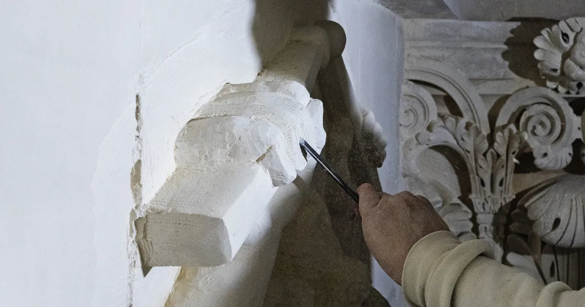 - Le staffeur intervient ponctuellement pour réaliser les moulages des reconstitutions en mortier des éléments lacunaires. Ces moulages seront ensuite utilisés comme modèles pour le sculpteur.