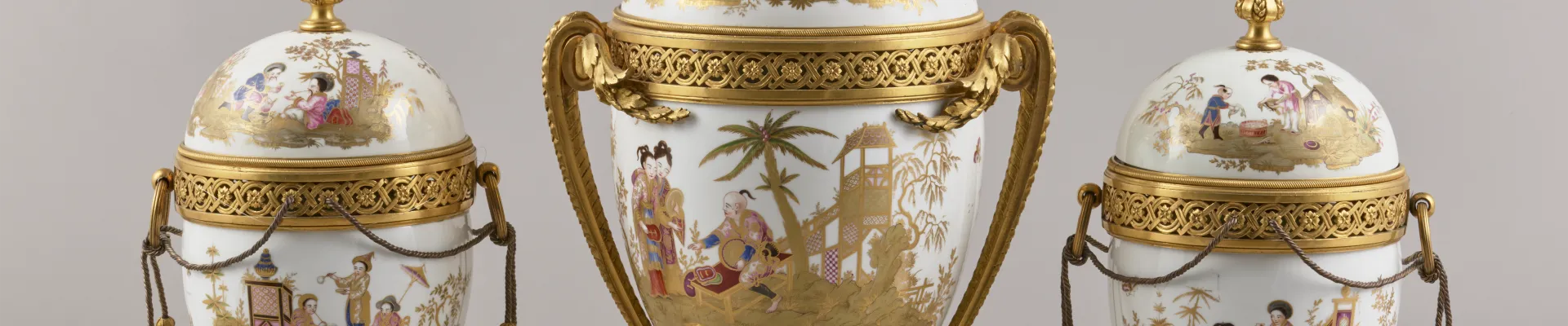 Entre 1775 et 1780, les ornements chinois prennent une place importante dans la nouvelle production de pâte dure mise en œuvre à la manufacture de porcelaine de Sèvres. L'usage de la pâte dure requiert une technique de décoration spécifique, parfaitement maîtrisée par Louis-François Lécot. L'artiste a déployé un usage prodigieux de la dorure appliquée sur de larges zones, se mélant aux coloris apposées au lavis où dominent le bleu, le rose, le vert, le noir. Les personnages chinois et leurs costumes dans des paysages à pagodes, sont soulignés d'un filet d'or ou d'un trait noir à l'imitation des motifs de soieries chinoises. Le travail des montures en bronze doré caractérise quant à lui, parfaitement l'art de Jean-Claude-Thomas Duplessis.