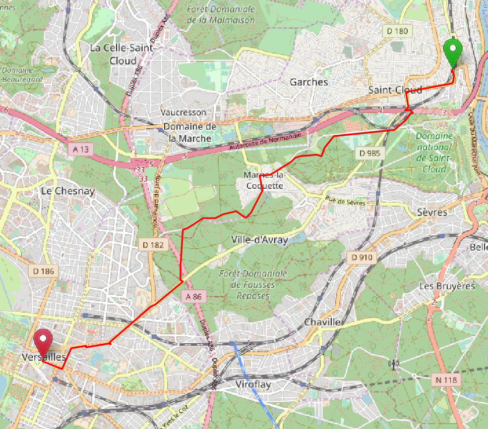 Depuis Paris (Porte Maillot) via le bois de Boulogne, le parc de Saint-Cloud, la forêt de Fausses Reposes