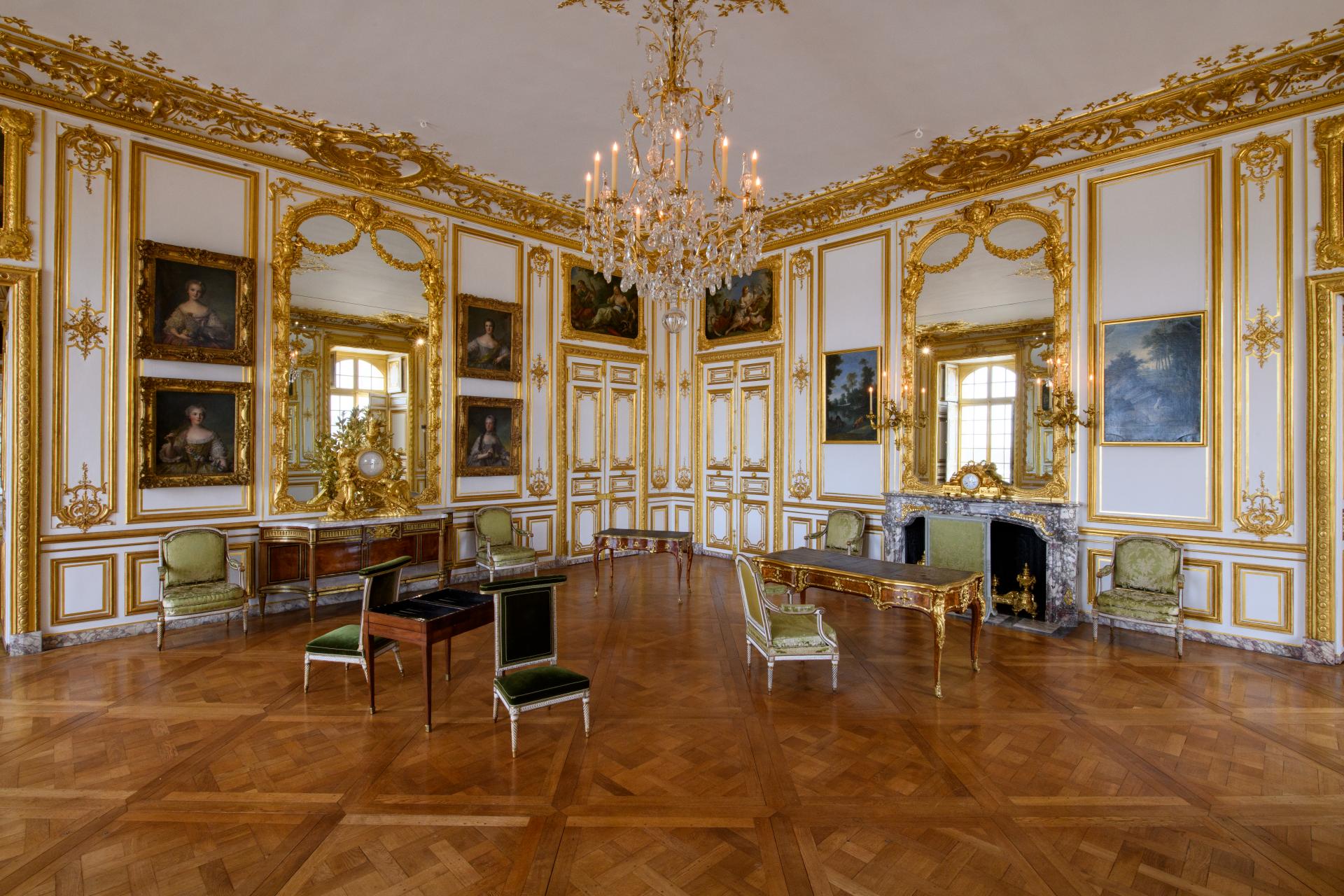 Les deux tiers de cette salle correspondent à l’ancien cabinet des Glaces du Grand Dauphin, qui était l’une des pièces les plus somptueuses de son appartement. Dans le parquet de marqueterie s’inscrivaient les chiffres entrelacés du prince et de son épouse. Le plafond et les murs étaient entièrement revêtus de miroirs enchâssés dans des encadrements de marqueterie d’ébène, d’étain et de cuivre où se réfléchissaient les gemmes enrichies de pierres précieuses, les porcelaines et les cristaux de roche, posés sur des consoles de bois doré. En 1747, la pièce fut agrandie et son merveilleux décor disparut pour faire place à de simples boiseries. La collection de peintures présente dans cette salle est de Jean-Marc Nattier : on y trouve des portraits de Mesdames, les filles de Louis XV.
