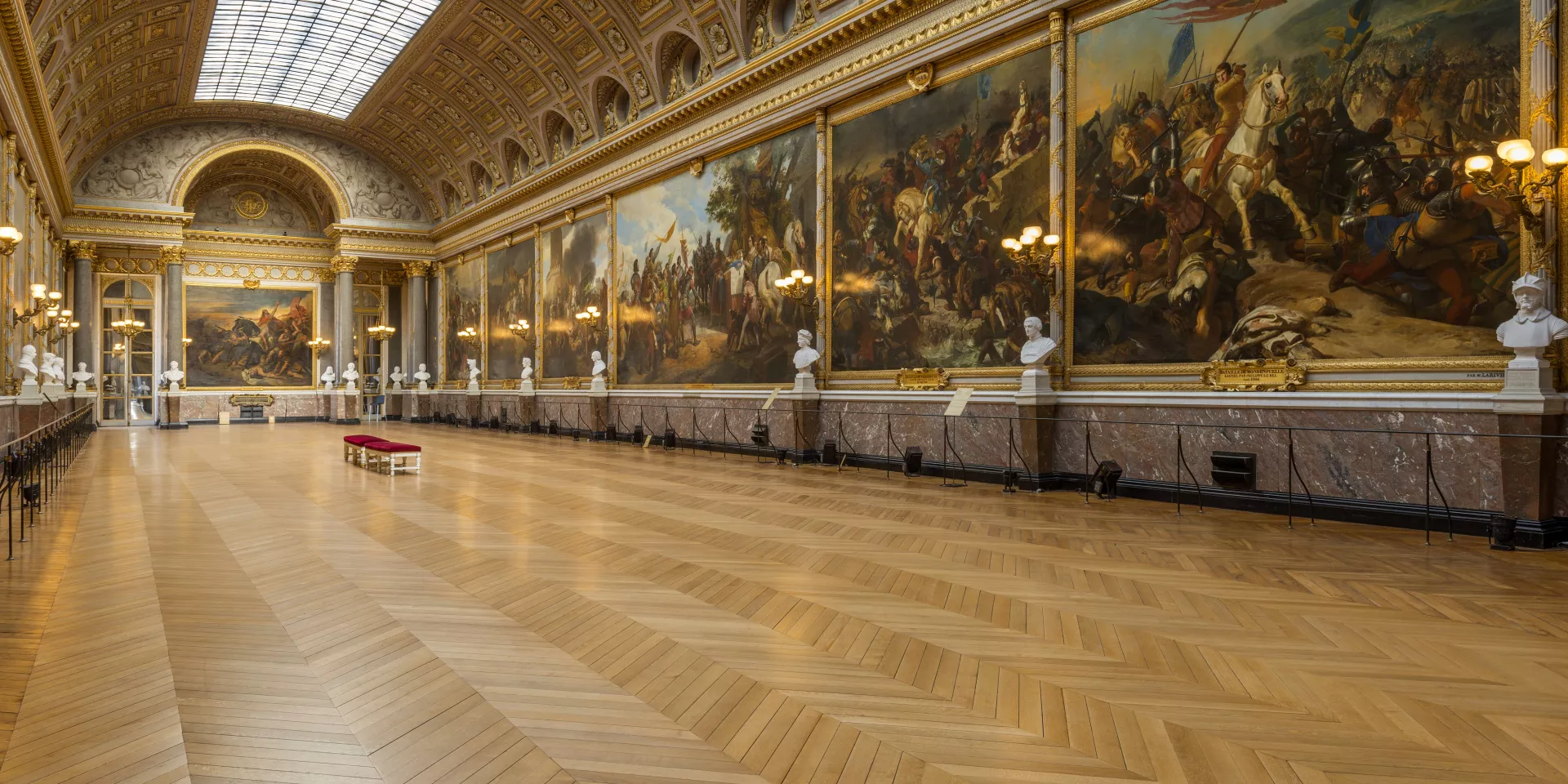 La galerie des Batailles est la pièce la plus vaste du Château (120 mètres de long, 13 mètres de large). Elle occupe la quasi-totalité du premier étage de l’aile du Midi. Conçue et réalisée à partir de 1833, elle est inaugurée solennellement le 10 juin 1837 et marque alors le point fort de la visite du musée de l’Histoire de France.
