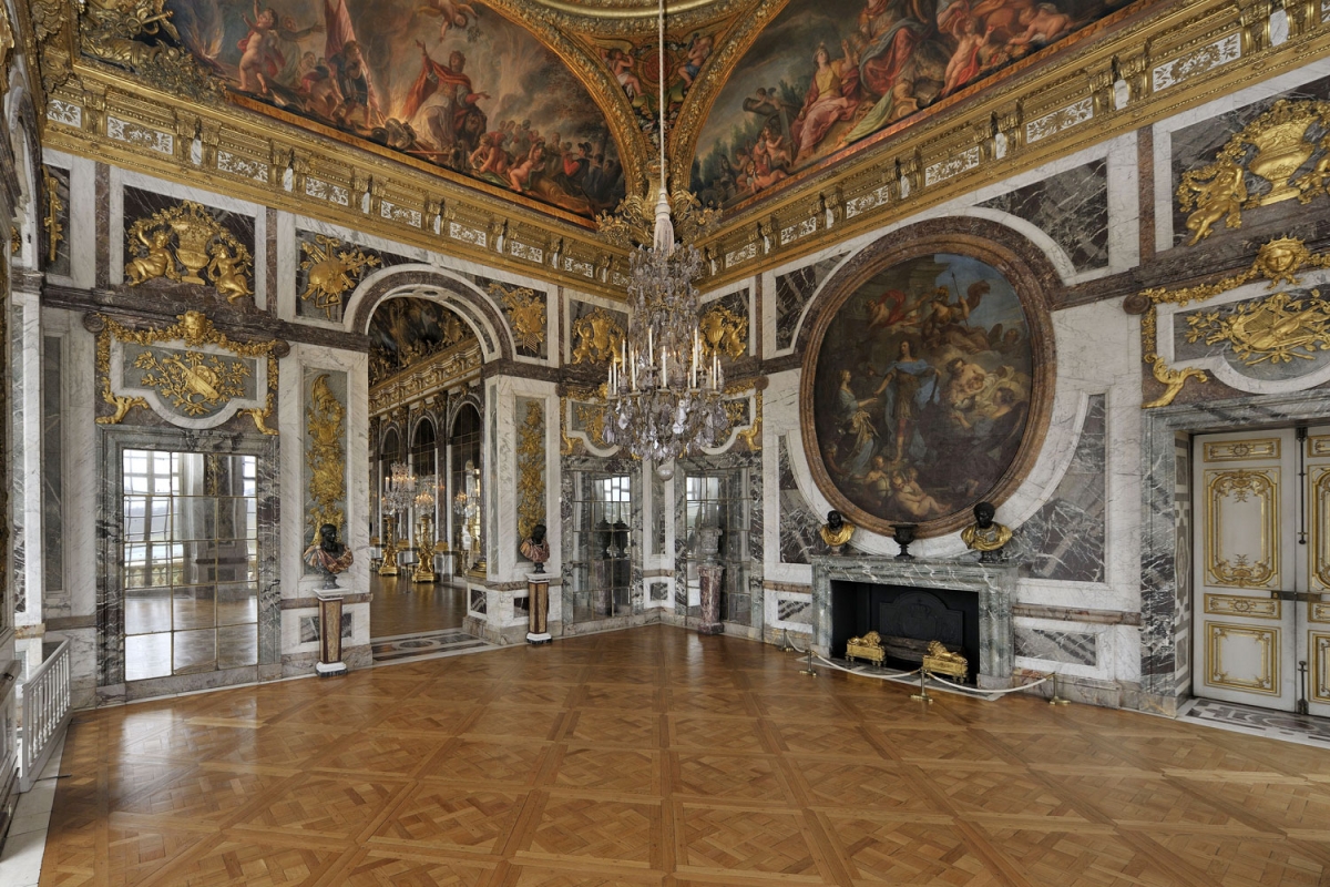 C’est à partir de 1678 qu’Hardouin‑Mansart entreprit la construction du salon de la Guerre. La décoration, achevée par Le Brun en 1686, exalte les victoires militaires qui aboutirent à la paix de Nimègue. Les murs sont revêtus de panneaux de marbre ornés de six trophées et de chutes d’armes en bronze doré. Le mur du côté du salon d’Apollon est occupé par un bas-relief ovale en stuc représentant Louis XIV à cheval foulant aux pieds ses ennemis. Ce chef-d’œuvre de Coysevox est surmonté de deux Renommées dorées et soutenu par deux captifs enchaînés. Au-dessous, dans le bas-relief occultant l’ouverture d’une fausse cheminée, Clio, muse de l’Histoire, consigne pour la postérité les hauts faits du roi. Le plafond en coupole représente au centre La France armée, assise sur un nuage et entourée de Victoires. Un portrait de Louis XIV orne son bouclier. Dans les voussures sont représentés ses trois ennemis vaincus : l’Allemagne à genoux, avec un aigle ; l’Espagne menaçante, avec un lion rugissant et la Hollande renversée sur un autre lion. La quatrième voussure représente Bellone, déesse de la guerre, en fureur entre la Rébellion et la Discorde.