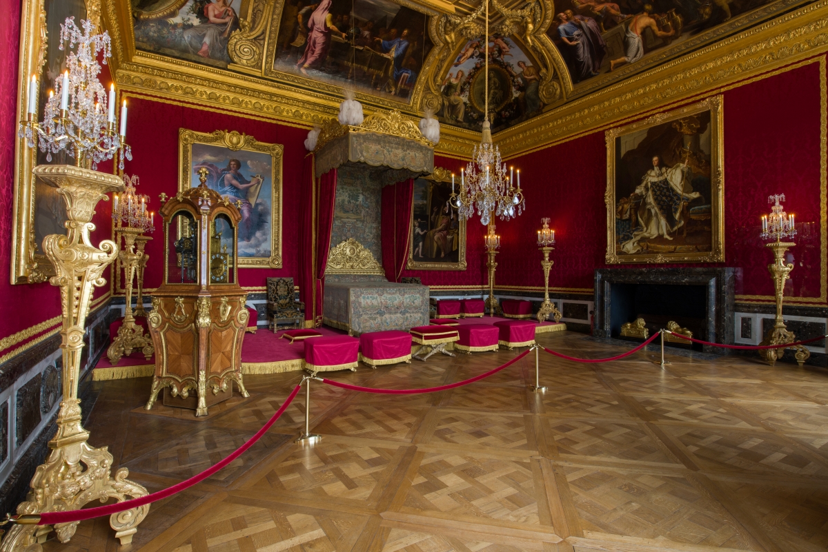 Le lit que l’on peut voir actuellement est celui que Louis-Philippe fit installer dans la chambre du Roi lors de la transformation de Versailles en musée. De part et d’autre sont accrochés deux tableaux que Louis XIV prisait tout particulièrement et qu’il avait fait exposer dans sa chambre : David jouant de la harpe par Le Dominiquin et Saint Jean à Patmos, alors attribué à Raphaël.