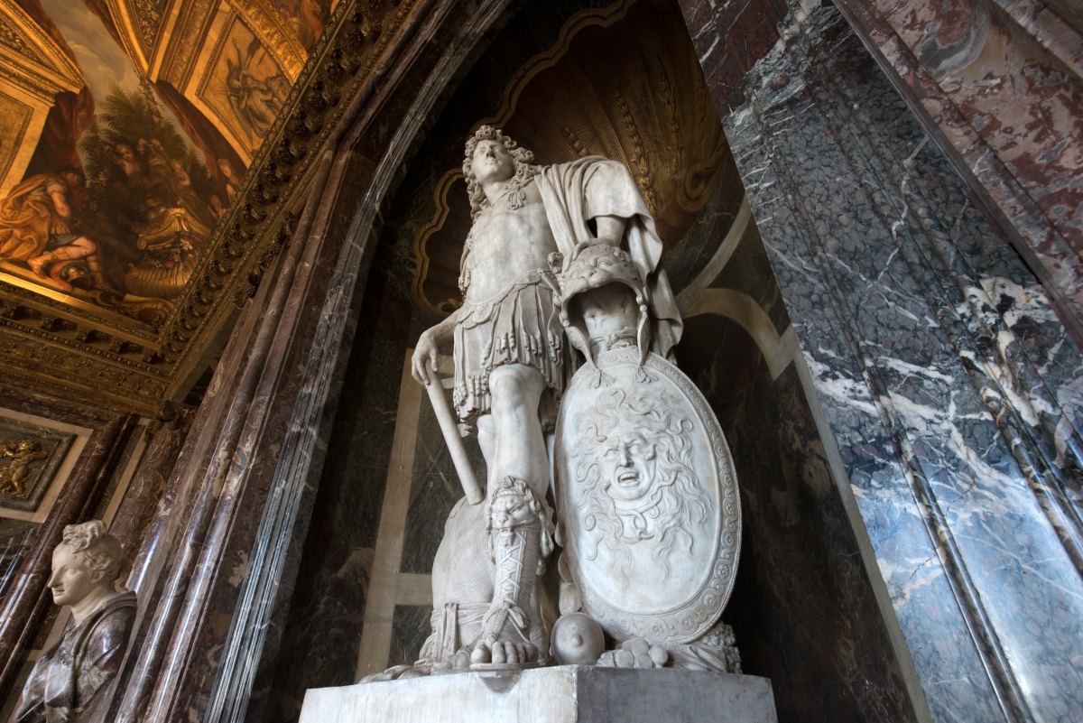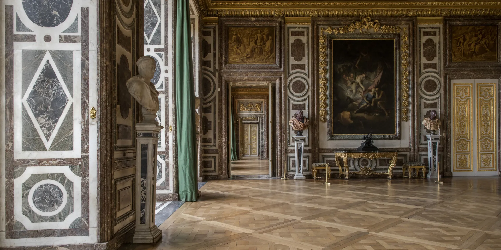 À la suite des deux salons précédents, conçus comme des vestibules, le salon de Mars marquait le début de l’appartement du roi proprement dit par sa fonction de salle des gardes. Sa consécration au dieu de la Guerre est donc tout à fait adéquate. Au centre du plafond, Claude Audran a peint Mars sur un char tiré par des loups. L’œuvre est encadrée par deux compositions ; l’une, à l’est, par Jouvenet : La Victoire soutenue par Hercule suivie de l’Abondance et de la Félicité ; l’autre, à l’ouest, par Houasse : La Terreur, la Fureur et l’Épouvante s’emparant des puissances de la terre. Les voussures, traitées en camaïeu d’or, célèbrent les triomphes guerriers des souverains de l’Antiquité auxquels répondent tout naturellement les hauts faits militaires du roi évoqués par les écoinçons de stuc doré des frères Marsy. Enfin, la corniche accentue la vocation militaire en étant ornée de casques et de coiffures guerrières variées.