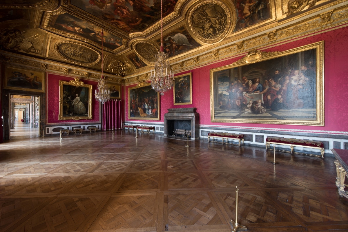 À gauche de la cheminée, on peut voir La Famille de Darius aux pieds d’Alexandre, par Charles Le Brun et à droite Les Pèlerins d’Emmaüs, d’après Véronèse : placés en pendant, selon la volonté du roi, ils révèlent la volonté de montrer que les peintres français pouvaient rivaliser avec les plus grands maîtres italiens. De part et d’autre de la cheminée, à l’emplacement où se trouvent aujourd’hui les tableaux, deux tribunes, supprimées en 1750, étaient destinées aux musiciens lorsque, les soirs d’appartement, le salon était réservé à la musique et à la danse.