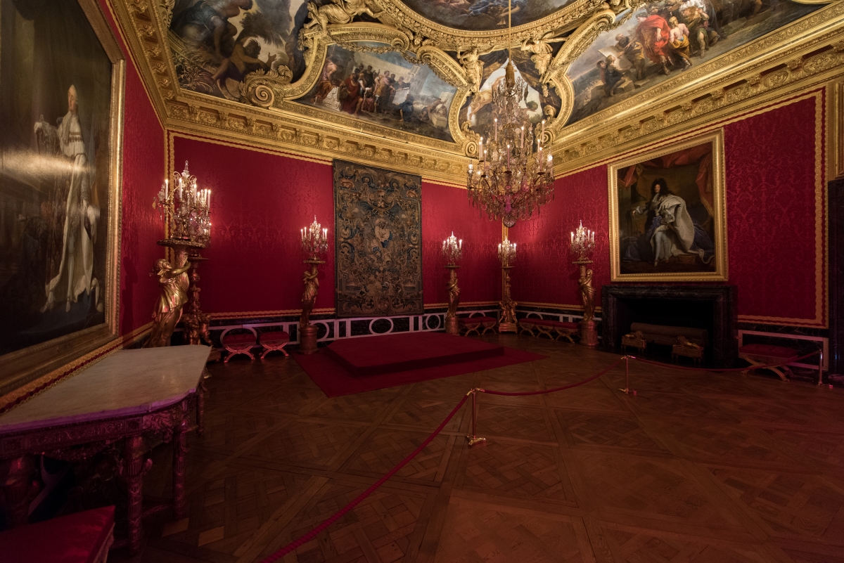 Jusqu’en 1689, une estrade sous un dais accueillait le célèbre trône d’argent de Louis XIV (en réalité un immense fauteuil en bois haut de deux mètres soixante, recouvert de plaques et de sculptures d’argent). Ce meuble extraordinaire envoyé à la fonte fut remplacé par une succession de fauteuils dorés, dont le style évolua au cours du temps.