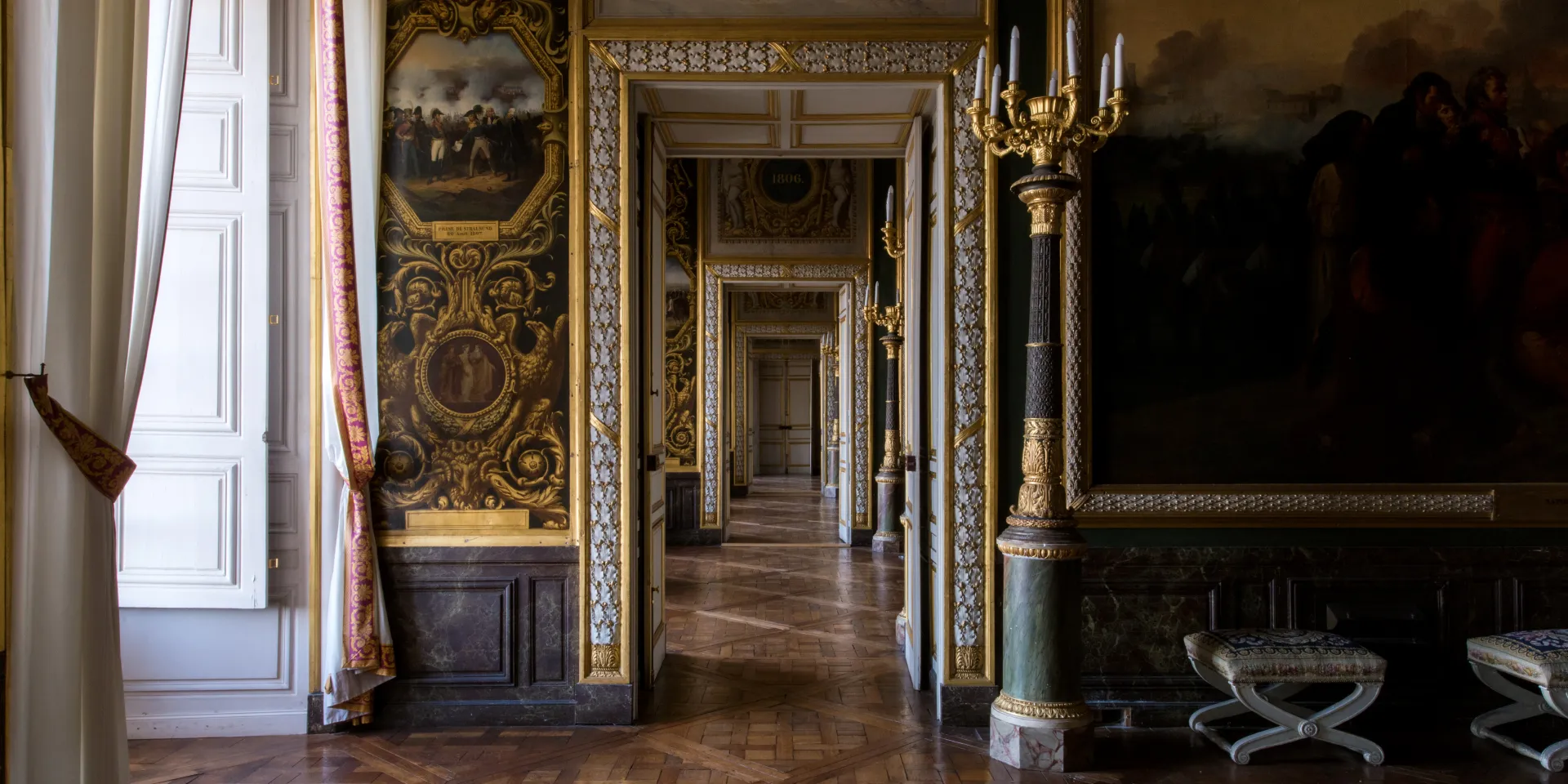 A Versailles, le Roi voulut consacrer de nombreux espaces au souvenir de l’Empire et c’est ainsi qu’il fit rassembler au rez-de-chaussée de l’aile sud du palais, sous la galerie des Batailles, la plupart des grands tableaux commandés par Napoléon pour sa communication politique, et qui décoraient les résidences impériales. Les treize salles de l’Empire racontent année après année, campagne après campagne, le formidable destin d’un jeune officier d’artillerie devenu en quelques années l’un des maîtres de l’Europe.