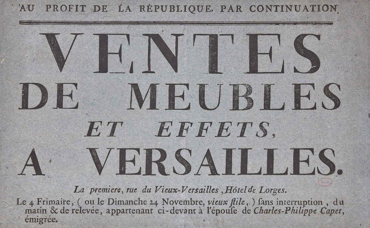 D’autre part, une loi promulguée le 10 juin 1793 programma l'aliénation du mobilier des anciens châteaux de la Couronne tout en exceptant des "monuments des arts et des sciences". Tous les meubles et objets d'ameublement concernés qui n'avaient pas suivi la famille royale aux Tuileries ou qui n'avaient pas été envoyés au Garde-Meuble ou réquisitionnés pour différents services, furent mis en vente pendant près d'un an, du 25 août 1793 au 11 août 1794. Pas moins de 17182 lots furent proposés, l’immense majorité d’entre eux étant achetée par des marchands parisiens et des « citoyens ».