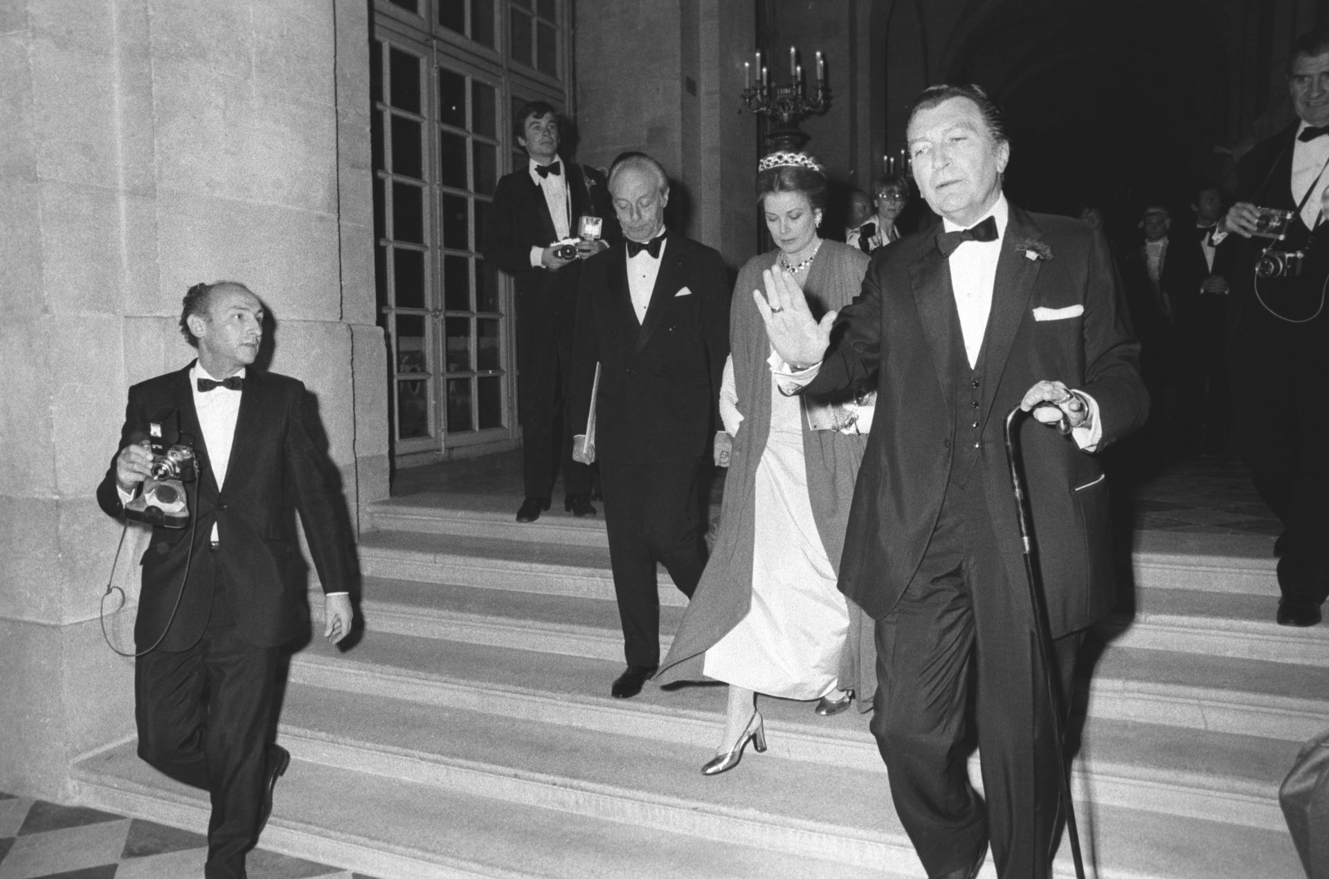Le conservateur en chef du musée national de Versailles, Gérald Van der Kemp, accompagné de la princesse Grace de Monaco, le soir du 28 novembre 1973