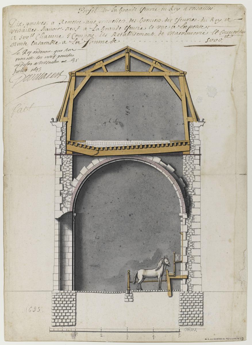 L’édification de la Grande et de la Petite Écurie entre 1679 et 1682 intervient alors que Louis XIV a entrepris, quelques quinze ans plus tôt, de donner un nouvel élan à ce département de sa maison. L’augmentation du nombre des chevaux sera d’ailleurs continue jusqu’à la fin de l’Ancien Régime. De près de 400 en 1680, ils seront 700 à la fin du règne de Louis XIV, puis 1 700 à la mort de Louis XV et 2 208 en 1787. Les deux écuries, conçues chacune pour environ 300 chevaux dont les stalles font 1 mètre 30 de large, seront donc rapidement insuffisantes et il faudra recourir à des emplacements supplémentaires dans Versailles ou dans les autres résidences royales.