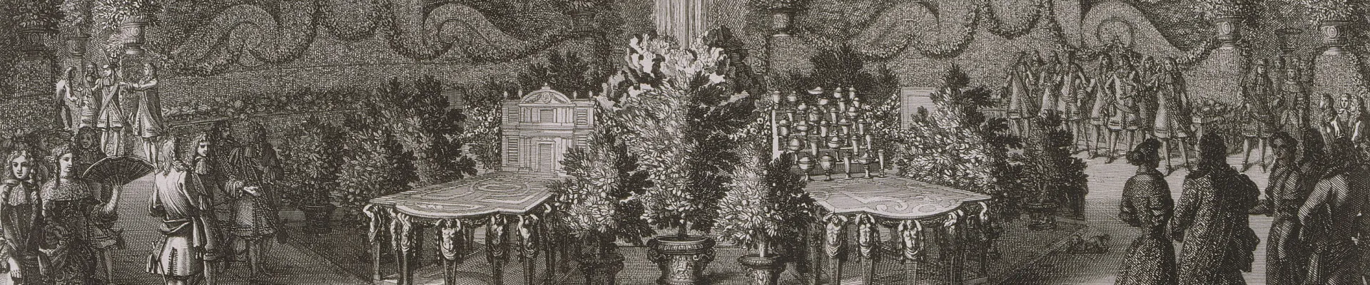 La Cour assiste ensuite au festin organisé à l’endroit du futur bassin de Flore, dans une grande salle octogonale en treillage dont le dôme est ouvert sur le ciel. Au centre d’une table est disposé un grand buffet orné d’une fontaine et d’une vaisselle d’argent. Le festin est suivi d’un bal organisé dans une salle installée au carrefour du futur bassin de Cérès. De forme octogonale également, la salle est précédée d’une galerie de verdure fermée par une grotte de rocailles. Réalisée par Le Vau, elle paraît couverte de marbre et de porphyre.