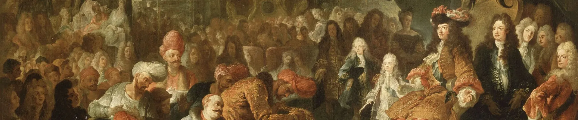 Le 19 février 1715 à 11h00, Mehmet Riza Beğ, ambassadeur extraordinaire, fait son entrée au Château, à cheval, avec sa suite, et accompagné de l’introducteur des ambassadeurs et du lieutenant des armées du roi. La foule a envahi l’avenue de Paris et les cours pour assister à la venue de cette visite exotique. On a dressé, dans la galerie des Glaces, quatre rangs de gradins pour accueillir les courtisans. Seuls les plus richement parés ont pu entrer. La galerie est noire de monde. Beaucoup d’étrangers sont également présents. Au fond, le roi, sur son trône, est entouré du futur Louis XV et de sa gouvernante, Mme de Ventadour, du duc d’Orléans et des princes du sang. Le peintre Coypel et Claude Gros de Boze, érudit, numismate et secrétaire de l’Académie des Inscriptions, sont au bas de l’estrade pour fixer ce moment.