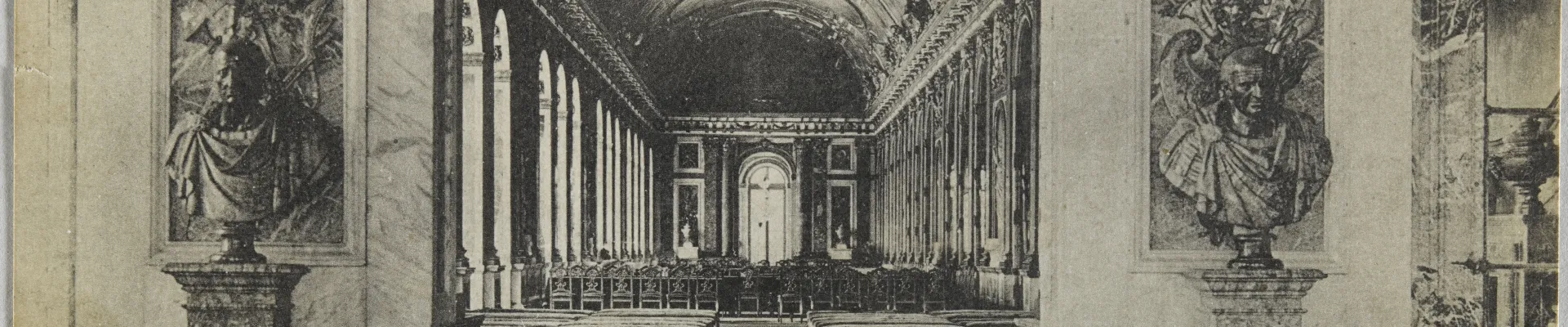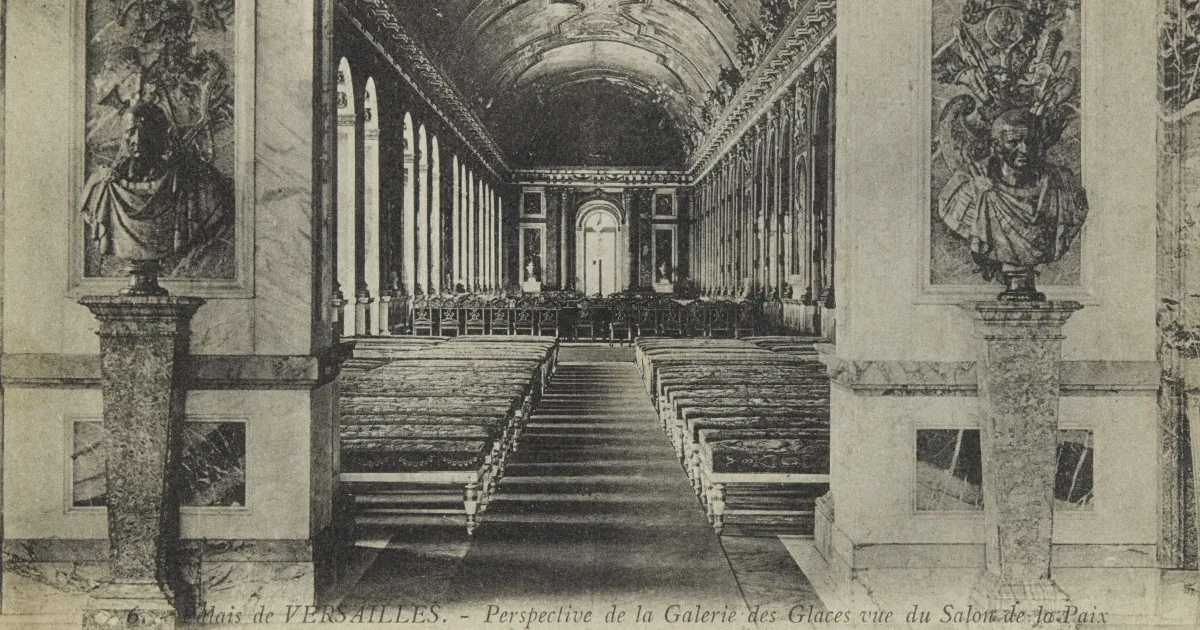 Près d’un demi-siècle après la proclamation de l’Empire allemand, Georges Clemenceau savoure sa revanche : le 28 juin 1919, l’Allemagne, vaincue, signe le traité de paix dans la galerie des Glaces, c’est-à-dire à l’endroit même où son empire avait été proclamé. La Première Guerre mondiale est finie. Un bureau Louis XV a été dressé au centre sous le tableau emblématique de Louis XIVLe roi gouverne par lui-même. La séance dure cinquante minutes. Aucun décorum, aucune musique pour célébrer ce moment solennel. 27 délégations représentant 32 puissances sont présentes. Sont assis à la table, les quatre représentants des principales nations alliées : Clémenceau pour la France, Wilson pour les États-Unis, Lloyd George pour la Grande-Bretagne, Orlando pour l’Italie. Müller, ministre des Affaires étrangères et le docteur Bell composent la délégation allemande.